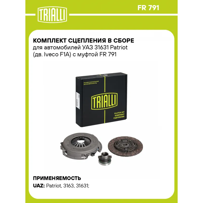 Комплект сцепления в сборе для автомобилей УАЗ 31631 Patriot (дв. Iveco F1A) с муфтой Характеристики: Артикул: FR 791 OEM номера: 3160-1601180, 31631-1601130, 330242-1601130-01, 3163-10-1601090, 3082000005, 63082001150 Гарантийный срок: 2 года/60 000 км Количество на автомобиль: 1 Диаметр, мм: 240 Число зубцов, шт.: 10 Профиль ступицы: 23x29.6x4(10) Комплектация (кол-во деталей, описание): FS 891, FD 391, CT 316 Сопутствующий товар: Ведомые диски сцепления: FD 391 Сопутствующий товар: Нажимные диски сцепления: FS 891 Сопутствующий товар: Муфты сцепления: CT 316 Товарная линейка: BLACK Подходит для авто: УАЗ Patriot (08-), 3163 (Patriot) (05-), 31631 Для проверки применяемости отправьте VIN автомобиля через вкладку "Есть вопросы о товаре?" Комплектация: Диск сцепления ведомый - 1 шт Диск сцепления нажимной - 1 шт Муфта выключения сцепления в сборе - 1 шт Гарантия: от 1 года.