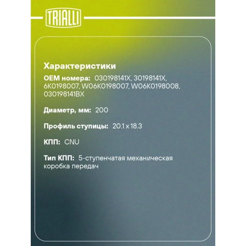 Комплект сцепления в сборе для автомобилей VW Golf (91-) 1.6i/ Polo III (94-) 1.4i/1.6i; SEAT Ibiza (93-) 1.4i/1.6i с муфтой (CNU) Характеристики: Артикул: FR 1803 OEM номера: 030198141X, 30198141X, 6K0198007, W06K0198007, W06K0198008, 030198141BX Тип КПП: CNU Количество на автомобиль: 1 Диаметр, мм: 200 Число зубцов, шт.: 24 Гарантийный срок: 2 года/60 000 км Профиль ступицы: 20.1x18.3 Сопутствующий товар: Комплекты сцепления: FR 1802 Товарная линейка: BLACK Подходит для авто: Volkswagen Golf III (91-), Polo III (94-), Vento (92-) Seat Ibiza (93-), Toledo (98-) Для проверки применяемости отправьте VIN автомобиля через вкладку "Есть вопросы о товаре?" Комплектация: Диск сцепления ведомый - 1 шт Диск сцепления нажимной - 1 шт Муфта выключения сцепления в сборе - 1 шт Гарантия: от 1 года.