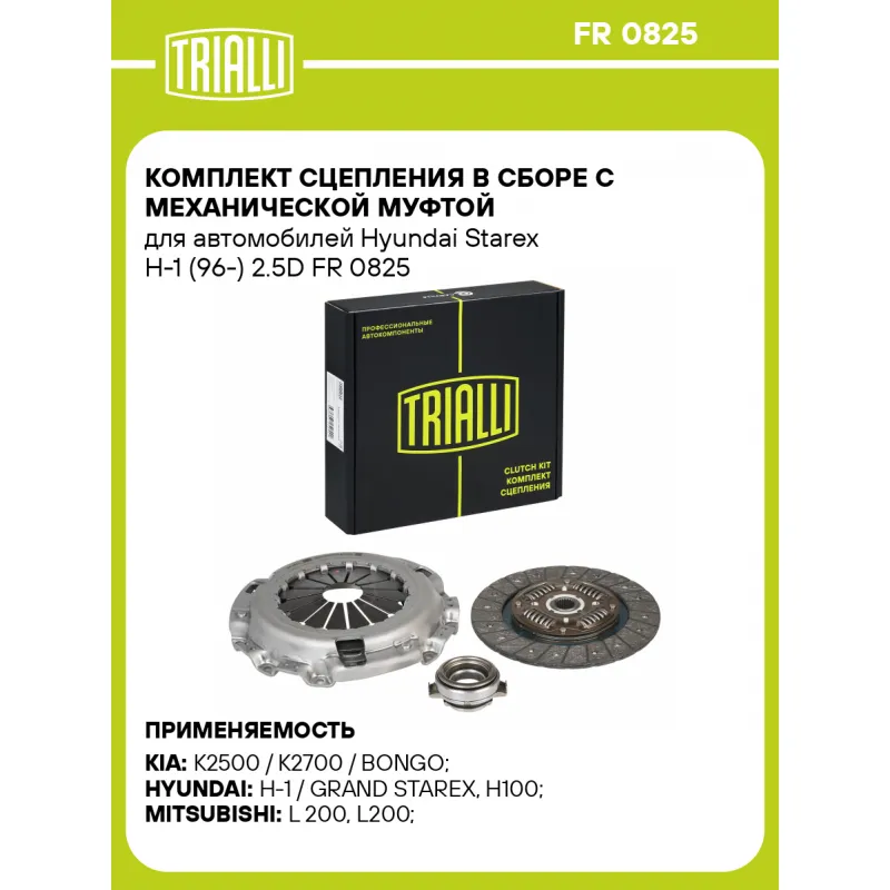 Комплект сцепления в сборе с механической муфтой для автомобилей Hyundai Starex H-1 (96-) 2.5D Характеристики: Артикул: FR 0825 OEM номера: 41420-45000, 41421-4A000, 41420-45001, 41412-4A000, 41100-4B030 , 41100-4B000, 41300-4A020, 41100-4B020, 41100-4B070, 41100-4B077, 41100-4B010, 41100-4B075, 41300-4A000 Количество на автомобиль: 1 Диаметр, мм: 240 Число зубцов, шт.: 23 Гарантийный срок: 2 года/60 000 км Профиль ступицы: 23.1 x 26.3 Товарная линейка: BLACK Комплектация: Диск сцепления ведомый - 1 шт Диск сцепления нажимной - 1 шт Муфта выключения сцепления в сборе - 1 шт Гарантия: от 1 года.