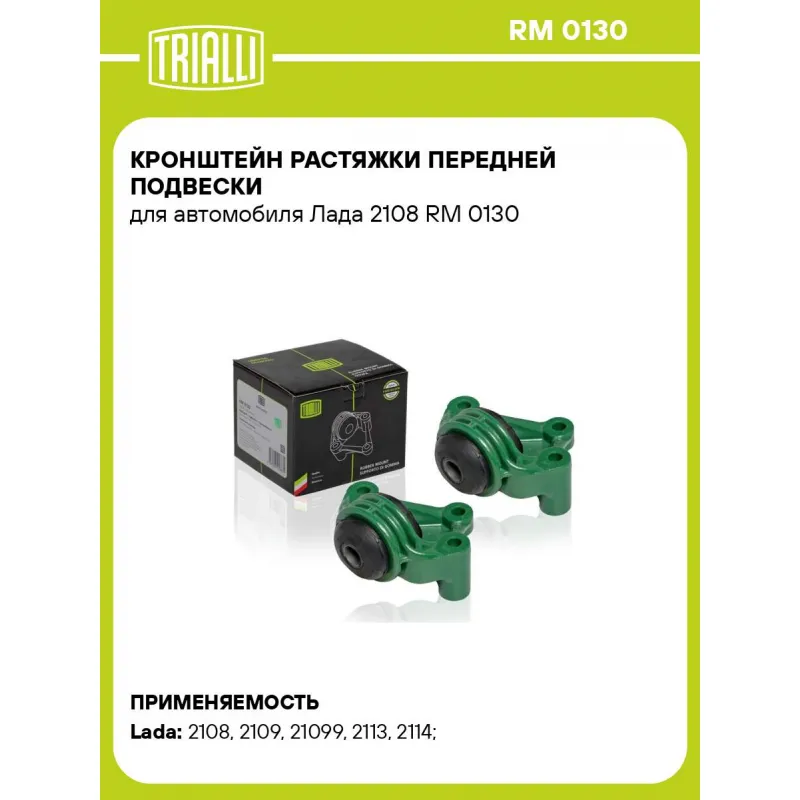 Кронштейн растяжки передней подвески для автомобиля Лада 2108 Характеристики: Артикул: RM 0130 OEM номера: 2108-2904049, 21080-2904049-00, 2108-2904055 Гарантийный срок: 2 года/60 тыс. Товарная линейка: BLACK Количество на автомобиль: 1 Материал: Резина/металл Подходит для авто: ВАЗ 2108, 2109, 21099, 2113, 2114, 2115, 2108, 2109, 21099 Для проверки применяемости отправьте VIN автомобиля через вкладку "Есть вопросы о товаре?" Комплектация: Кронштейн - 2 шт Гарантия: от 1 года.