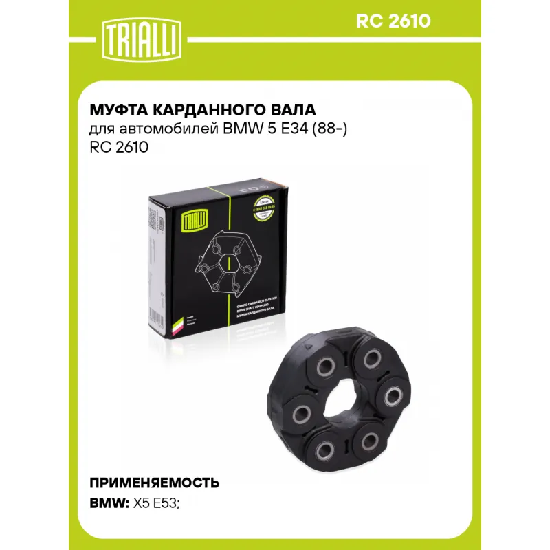 Муфта карданного вала для автомобилей BMW 5 E34 (88-) Характеристики: Артикул: RC 2610 OEM номера: 26 11 1 204 294, 26 11 1 207 785, 26 11 1 225 624 Гарантийный срок: 1 год/30 000км Количество на автомобиль: 1 Материал: Резина/сталь/нейлоновый корд Товарная линейка: BLACK Подходит для авто: BMW X5 E53 (99-), X5 E53 (99-), X5 E53 (99-) Для проверки применяемости отправьте VIN автомобиля через вкладку "Есть вопросы о товаре?" Комплектация: Муфта - 1 шт Руководство по установке - 1 шт Гарантия: от 1 года.