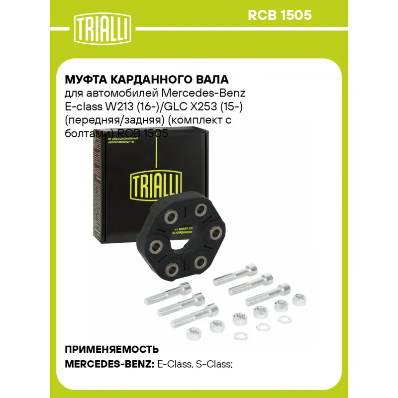 Муфта карданного вала для автомобилей Mercedes-Benz E-class W213 (16-)/GLC X253 (15-) (передняя/задняя) (комплект с болтами) Характеристики: Артикул: RCB 1505 OEM номера: A205 411 00 00, A205 411 00 00 S1, 205 411 00 00, 205 411 00 00 S1 Материал: Резина/сталь Гарантийный срок: 1 год/ 30 000 км Товарная линейка: BLACK Количество на автомобиль: 1 Комплектация: Руководство по установке - 1 шт Шайба - 3 шт Болт M12x1,5x60 - 6 шт Муфта - 1 шт Гайка M12x1,5x18 - 6 шт Гарантия: от 1 года.
