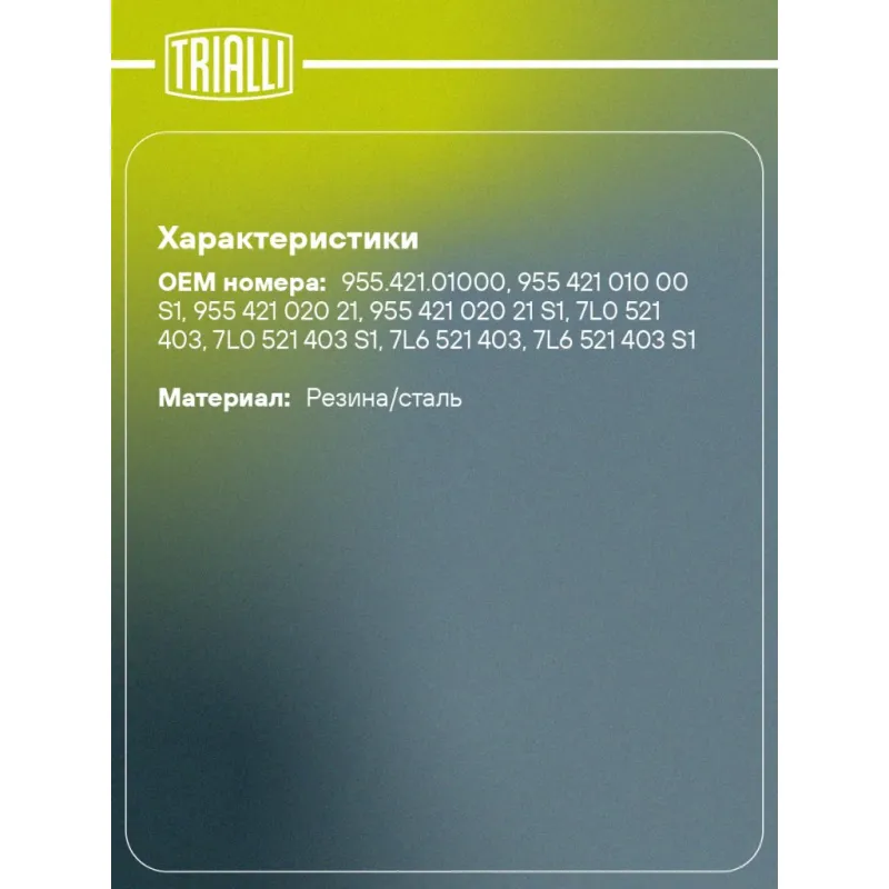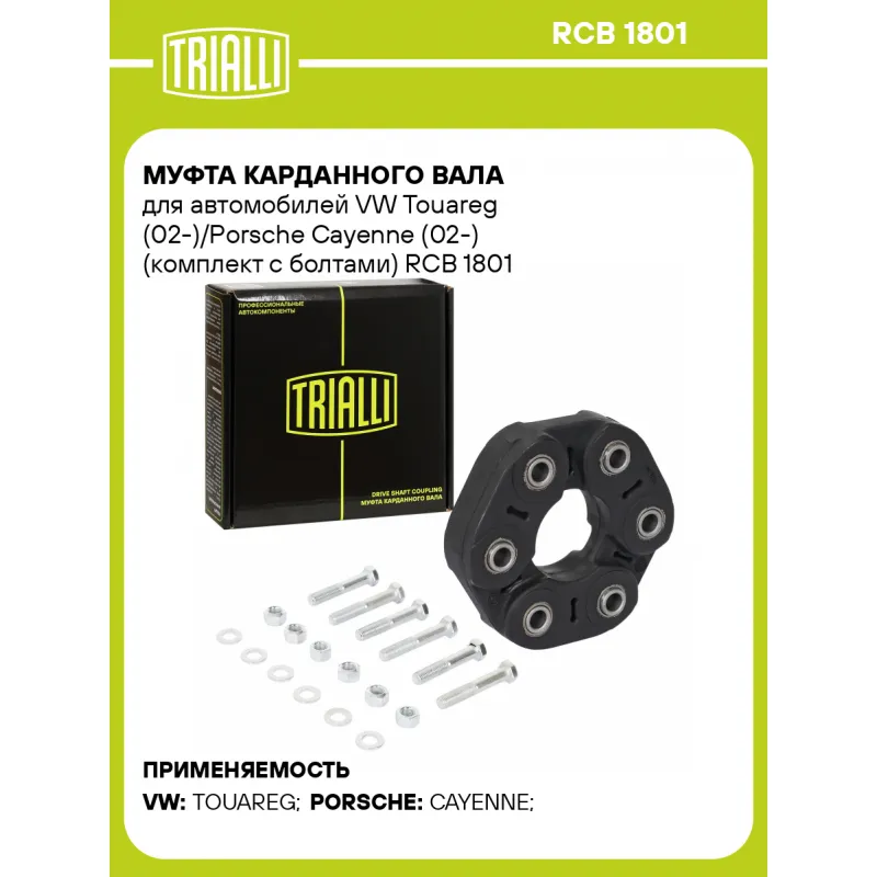 Муфта карданного вала для автомобилей VW Touareg (02-)/Porsche Cayenne (02-) (комплект с болтами) Характеристики: Артикул: RCB 1801 OEM номера: 955.421.01000, 955 421 010 00 S1, 955 421 020 21, 955 421 020 21 S1, 7L0 521 403, 7L0 521 403 S1, 7L6 521 403, 7L6 521 403 S1 Гарантийный срок: 1 год/ 30 000 км Товарная линейка: BLACK Количество на автомобиль: 1 Материал: Резина/сталь Комплектация: Руководство по установке - 1 шт Шайба - 6 шт Муфта - 1 шт Болт M12x1,5x65 - 3 шт Болт M12x1,5x70 - 3 шт Гайка M12x1,5x18 - 6 шт Гарантия: от 1 года.