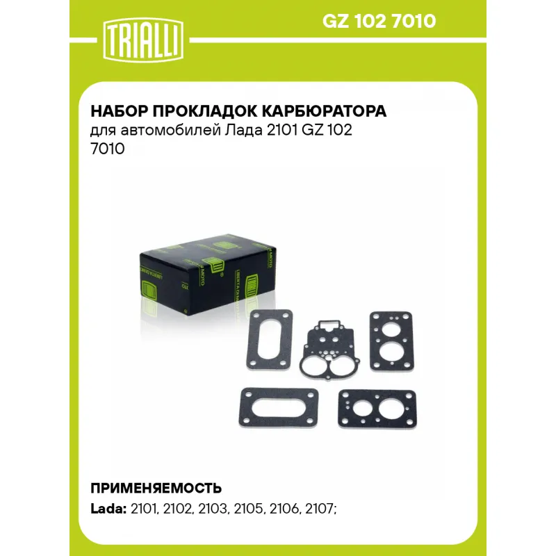 Набор прокладок карбюратора для автомобилей Лада 2101 Характеристики: Артикул: GZ 102 7010 OEM номера: 2101-1107015, 2101-1107608, 2101-1107014 Гарантийный срок: 2 года/60 000 км. Количество на автомобиль: 1 Сопутствующие товары:: GZ 102 0120 Материал: Безасбестовый Трансмиссия: M ABS: - Подходит для авто: ВАЗ 2101, 2102, 2103, 2105, 2106, 2107, 2107, 2121, 2104 Для проверки применяемости отправьте VIN автомобиля через вкладку "Есть вопросы о товаре?" Комплектация: Набор прокладок для ремонта карбюратора - 1 шт Гарантия: от 1 года.