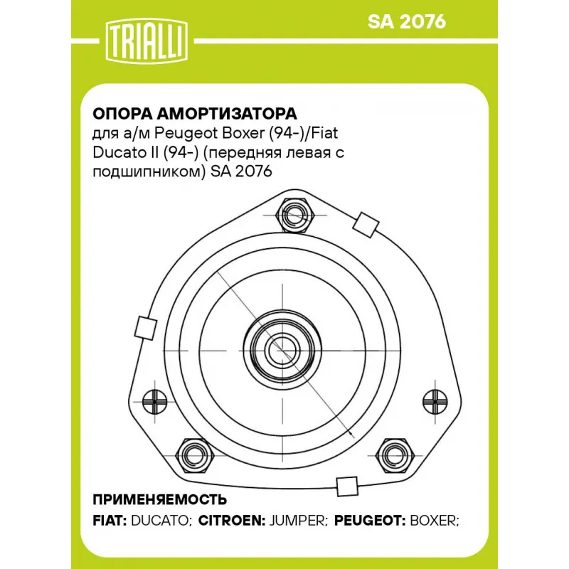Опора амортизатора для автомобилей Peugeot Boxer (94-)/Fiat Ducato II (94-) (передняя левая с подшипником) Характеристики: Артикул: SA 2076 OEM номера: 503841, 1307241080, 503171, 503818, 503874, 503872, 503547, 1318573080, 1323165080, 1355179080, 1342879080, 1620298580 Материал: Резина/металл Ось (сторона установки): Спереди, с... Читать полностью →
