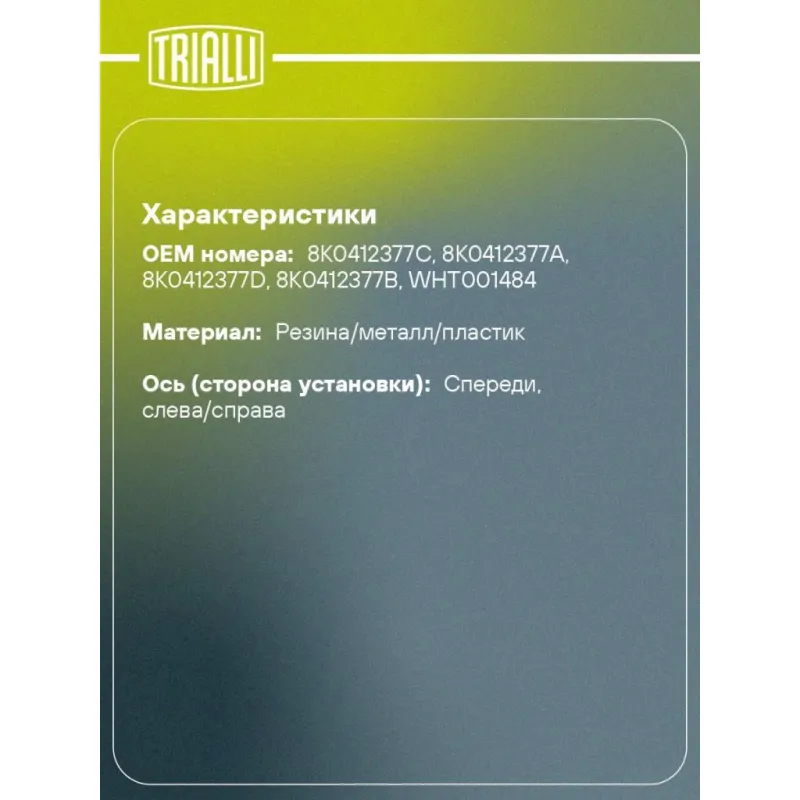 Опора амортизатора для автомобилей Audi A4 (07-)/A5 (07-)/Q5 (08-) (передняя без подшипника) Характеристики: Артикул: SA 1814 OEM номера: 8K0412377C, 8K0412377A, 8K0412377D, 8K0412377B, WHT001484 Материал: Резина/металл/пластик Ось (сторона установки): Спереди, слева/справа Гарантийный срок: 2 года/60 000 км Товарная линейка: BLACK Количество на автомобиль: 2 Дополнительная информация: Упаковка изделия может отличаться от представленной на фото Комплектация: Опора амортизационной стойки - 1 шт Гарантия: от 1 года.