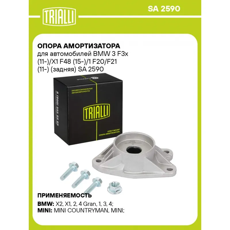 Опора амортизатора для автомобилей BMW 3 F3x (11-)/X1 F48 (15-)/1 F20/F21 (11-) (задняя) Характеристики: Артикул: SA 2590 OEM номера: 33506862725, 31306869889, 33506865257, 33506865260, 33506791706, 7119907137, 33506864452, 33504087804, 33506798876 Материал: Резина/металл Ось (сторона установки): Сзади, слева/справа Гарантийный ... Читать полностью →