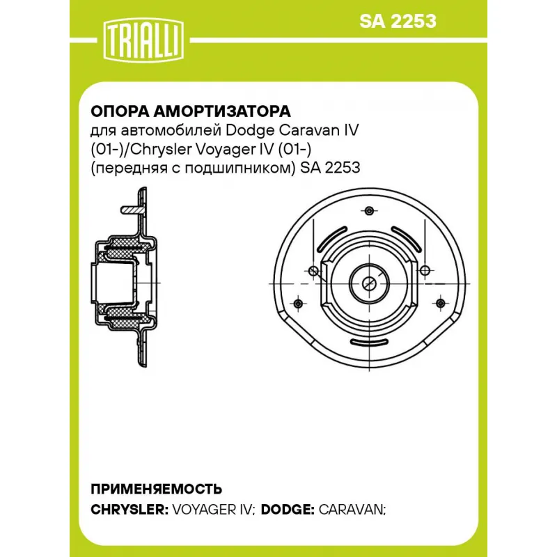 Опора амортизатора для автомобилей Dodge Caravan IV (01-)/Chrysler Voyager IV (01-) (передняя с подшипником) Характеристики: Артикул: SA 2253 OEM номера: 04766116AA, 04743044AA, 04766116AB Материал: Резина/металл/пластик Ось (сторона установки): Спереди, слева/справа Гарантийный срок: 2 года/60 000 км Товарная линейка: BLACK Количество на автомобиль: 2 Дополнительная информация: Упаковка изделия может отличаться от представленной на фото Комплектация: Подшипник - 1 шт Опора амортизационной стойки - 1 шт Гарантия: от 1 года.
