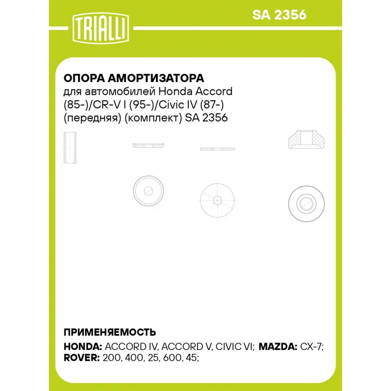 Опора амортизатора для автомобилей Honda Accord (85-)/CR-V I (95-)/Civic IV (87-) (передняя) (комплект) Характеристики: Артикул: SA 2356 OEM номера: 51631SL0003, 52725SK3000, 5862053020, 52728SK3000, EG2328910D, 51621SD4004, 51728SR0003, 51621S84A01, 5862031700, EH4428910A, 5862053010, 51631SH0003, 52725SJ4000, 51685SR0004, EH4828910B, 5862074450, 51631SS0004, 52621SK3000, 51631SB0003, 52631S84A01, EH4428910, 5862031730, 51631SB0004, EH4628910A, 52621634000, 52725SR0003, 52621SB2004, 51631SV7004, 51685SH3014, 52728SM1A02, 51621SR0003, 52675SS0004, EG2328910C, EH4828910A, EH4628910, EG2128910F, EG2128910E, EH4828910 Материал: Резина/металл Ось (сторона установки): Спереди, слева/справа Гарантийный срок: 2 года/60 000 км Товарная линейка: BLACK Количество на автомобиль: 2 Дополнительная информация: Упаковка изделия может отличаться от представленной на фото Комплектация: Втулка - 1 шт Подушка резиновая - 2 шт Металлическая шайба - 2 шт Гарантия: от 1 года.
