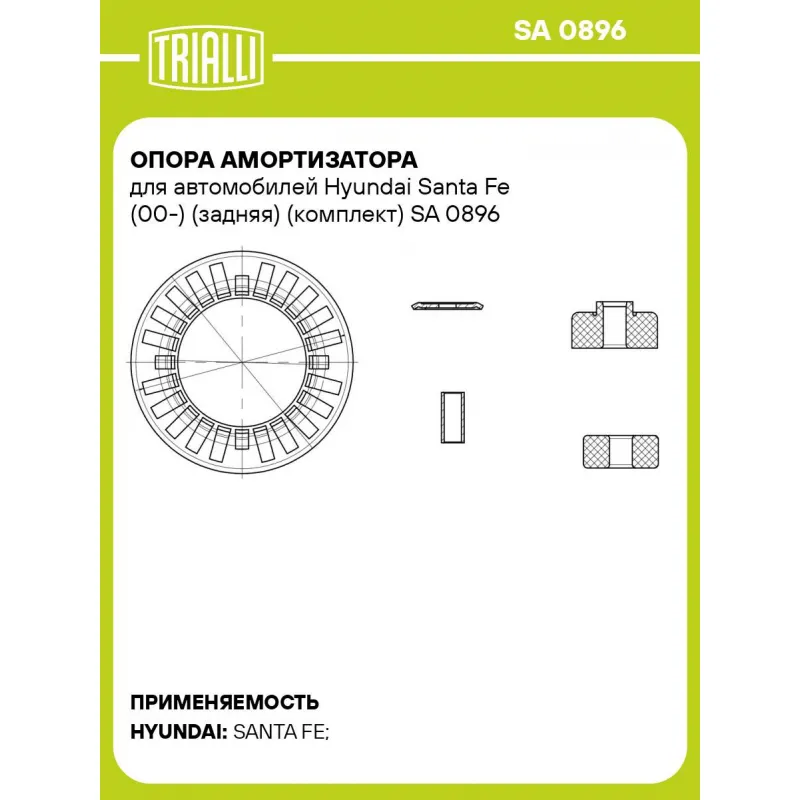 Опора амортизатора для автомобилей Hyundai Santa Fe (00-) (задняя) (комплект) Характеристики: Артикул: SA 0896 OEM номера: 5531026000, 5532526500, 5531526000, 5532026000, 5534126000 Материал: Резина/металл Ось (сторона установки): Сзади, слева/справа Гарантийный срок: 2 года/60 000 км Товарная линейка: BLACK Количество на автомо... Читать полностью →