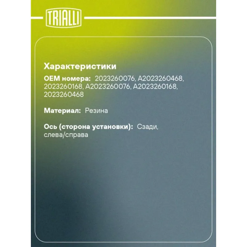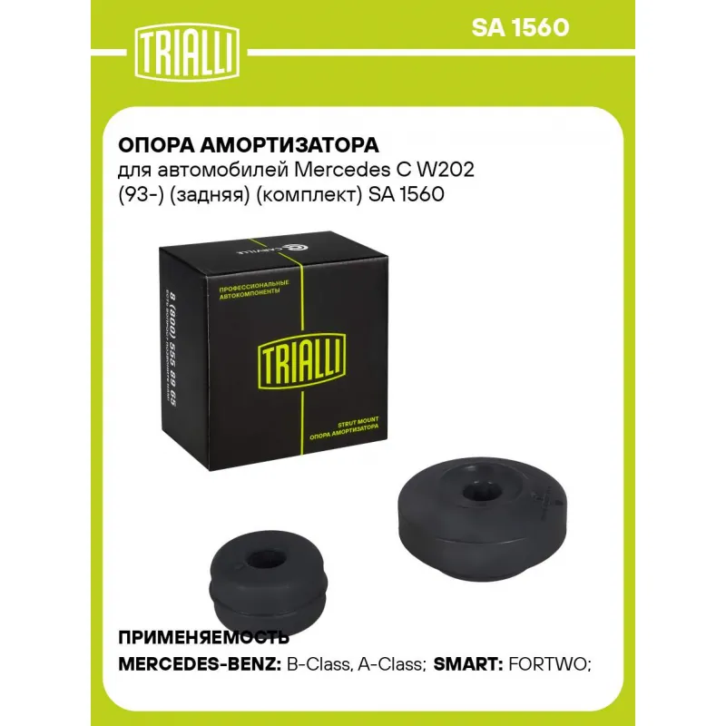 Опора амортизатора для автомобилей Mercedes C W202 (93-) (задняя) (комплект) Характеристики: Артикул: SA 1560 OEM номера: 2023260076, A2023260468, 2023260168, A2023260076, A2023260168, 2023260468 Материал: Резина Ось (сторона установки): Сзади, слева/справа Гарантийный срок: 2 года/60 000 км Товарная линейка: BLACK Количество на автомобиль: 2 Дополнительная информация: Упаковка изделия может отличаться от представленной на фото Комплектация: Подушка резиновая - 2 шт Гарантия: от 1 года.