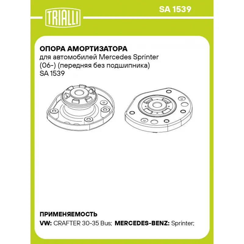Опора амортизатора для автомобилей Mercedes Sprinter (06-) (передняя без подшипника) Характеристики: Артикул: SA 1539 OEM номера: A9063230520, 9063230520, A 906 323 05 20 64, 2E0407181C Материал: Резина/металл Ось (сторона установки): Спереди, слева/справа Гарантийный срок: 2 года/60 000 км Товарная линейка: BLACK Количество на автомобиль: 2 Дополнительная информация: Упаковка изделия может отличаться от представленной на фото Комплектация: Опора амортизационной стойки - 1 шт Гарантия: от 1 года.