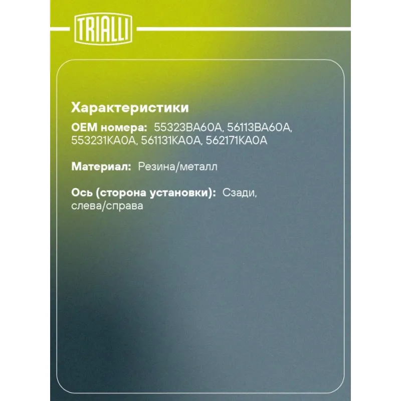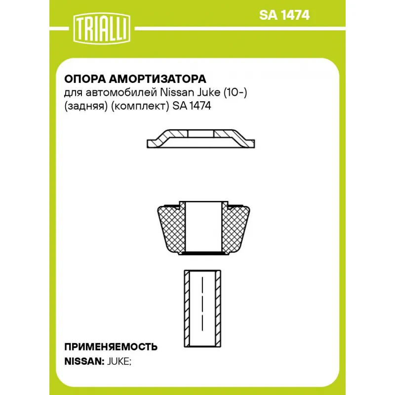 Опора амортизатора для автомобилей Nissan Juke (10-) (задняя) (комплект) Характеристики: Артикул: SA 1474 OEM номера: 55323BA60A, 56113BA60A, 553231KA0A, 561131KA0A, 562171KA0A Материал: Резина/металл Ось (сторона установки): Сзади, слева/справа Гарантийный срок: 2 года/60 000 км Товарная линейка: BLACK Количество на автомобиль:... Читать полностью →