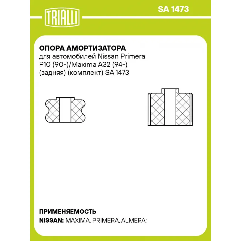 Опора амортизатора для автомобилей Nissan Primera P10 (90-)/Maxima A32 (94-) (задняя) (комплект) Характеристики: Артикул: SA 1473 OEM номера: 5621761L10, 5621890J00, 562170M800, 5621790J00, 562180M800, 5621739U00, 5621861L10, 5621771L00, 5621801U00, 5621835F00, 5621733P00 Материал: Резина Ось (сторона установки): Сзади, слева/сп... Читать полностью →