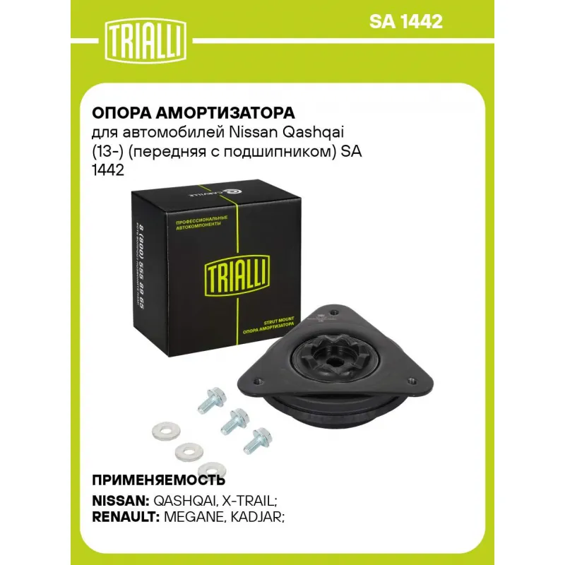 Опора амортизатора для автомобилей Nissan Qashqai (13-) (передняя с подшипником) Характеристики: Артикул: SA 1442 OEM номера: 543206968R, 543258271R, 5432000Q0C, 54459EN00A, 5432500Q0B, 7703602222 Материал: Резина/металл/пластик Ось (сторона установки): Спереди, слева/справа Гарантийный срок: 2 года/60 000 км Товарная линейка: B... Читать полностью →
