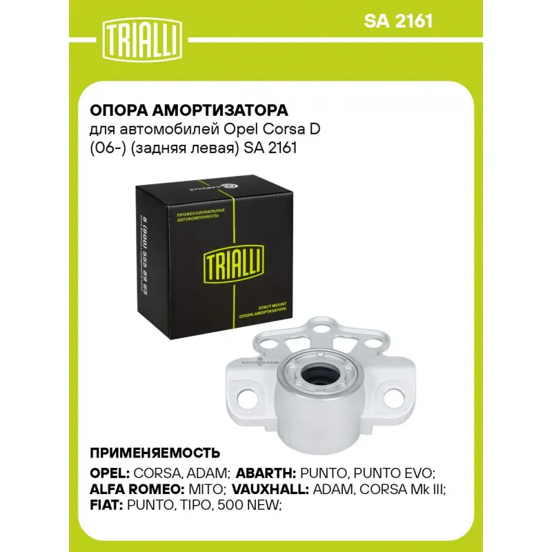 Опора амортизатора для автомобилей Opel Corsa D (06-) (задняя левая) Характеристики: Артикул: SA 2161 OEM номера: 51803173, 51885481, 436773, 55703317, 55701902 Материал: Резина/металл Ось (сторона установки): Сзади, слева Гарантийный срок: 2 года/60 000 км Товарная линейка: BLACK Парный товар: SA 2160 Количество на автомобиль: 1 Дополнительная информация: Упаковка изделия может отличаться от представленной на фото Комплектация: Опора амортизатора - 1 шт Гарантия: от 1 года.