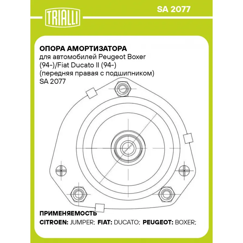 Опора амортизатора для автомобилей Peugeot Boxer (94-)/Fiat Ducato II (94-) (передняя правая с подшипником) Характеристики: Артикул: SA 2077 OEM номера: 503842, 1307242080, 503819, 503170, 503547, 503872, 503874, 1323166080, 1318573080, 1355179080, 1342879080, 1620298580 Материал: Резина/металл Ось (сторона установки): Спереди, ... Читать полностью →