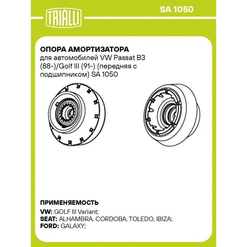 Опора амортизатора для автомобилей VW Passat B3 (88-)/Golf III (91-) (передняя с подшипником) Характеристики: Артикул: SA 1050 OEM номера: 1102592, 95VW3K031AA, 95VW3K099AB, 7201848, 7M0412331, 357412331A, 1J0412249 Материал: Резина/металл/пластик Ось (сторона установки): Спереди, слева/справа Гарантийный срок: 2 года/60 000 км ... Читать полностью →