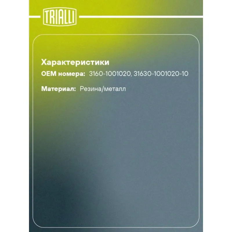 Опора двигателя передняя для автомобиля УАЗ 3151/3163 Характеристики: Артикул: RM 0306 OEM номера: 3160-1001020, 31630-1001020-10 Дополнительная информация: Для а/м после 2019 г.в. / Для а/м с АКПП Гарантийный срок: 2 года/60 тыс. Товарная линейка: BLACK Количество на автомобиль: 1 Материал: Резина/металл Подходит для авто: УАЗ 31519, 3303, 3160 (97-), 3162 (00-), 3163 (Patriot) (05-), 3303 Для проверки применяемости отправьте VIN автомобиля через вкладку "Есть вопросы о товаре?" Комплектация: Опора двигателя - 1 шт Гарантия: от 1 года.