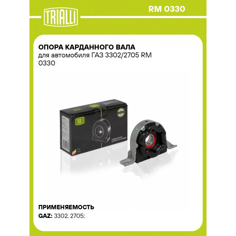Опора карданного вала для автомобиля ГАЗ 3302/2705 Характеристики: Артикул: RM 0330 OEM номера: 3302-2202081, 3302-2202085 Материал: Резина/Металл Гарантийный срок: 1 год/ 30 000 км Товарная линейка: BLACK Количество на автомобиль: 1 Подходит для авто: ГАЗ 3302, 3302, 2705, 2705, 2705 Для проверки применяемости отправьте VIN автомобиля через вкладку "Есть вопросы о товаре?" Комплектация: Опора карданного вала - 1 шт Гарантия: от 1 года.