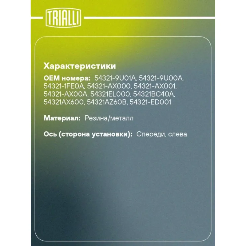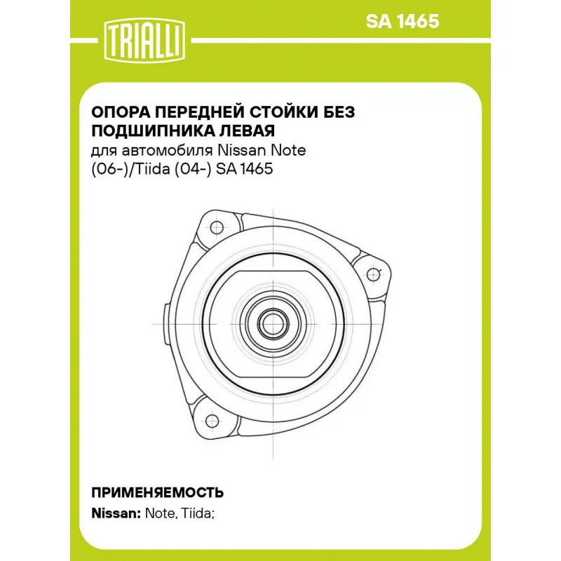 Опора передней стойки без подшипника левая для автомобиля Nissan Note (06-)/Tiida (04-) Характеристики: Артикул: SA 1465 OEM номера: 54321-9U01A, 54321-9U00A, 54321-1FE0A, 54321-AX000, 54321-AX001, 54321-AX00A, 54321EL000, 54321BC40A, 54321AX600, 54321AZ60B, 54321-ED001, 54321-ED500, 54321-EW80A, 54321-EW80B, 54321ZE70A Товарная линейка: BLACK Парный товар: SA 1466 Количество на автомобиль: 1 Материал: Резина/металл Ось (сторона установки): Спереди, слева Сопутствующий товар: Амортизаторы: AG 14160; AG 14361; AG 14507 Гарантийный срок: 2 года/60 000 км Дополнительная информация: Упаковка изделия может отличаться от представленной на фото Подходит для авто: Nissan Note (06-), Note (06-), Tiida (04-) Для проверки применяемости отправьте VIN автомобиля через вкладку "Есть вопросы о товаре?" Комплектация: Гарантийный талон - 1 шт Опора амортизационной стойки - 1 шт Гарантия: от 1 года.