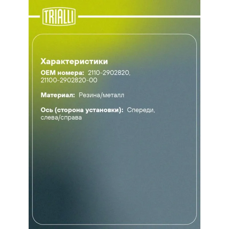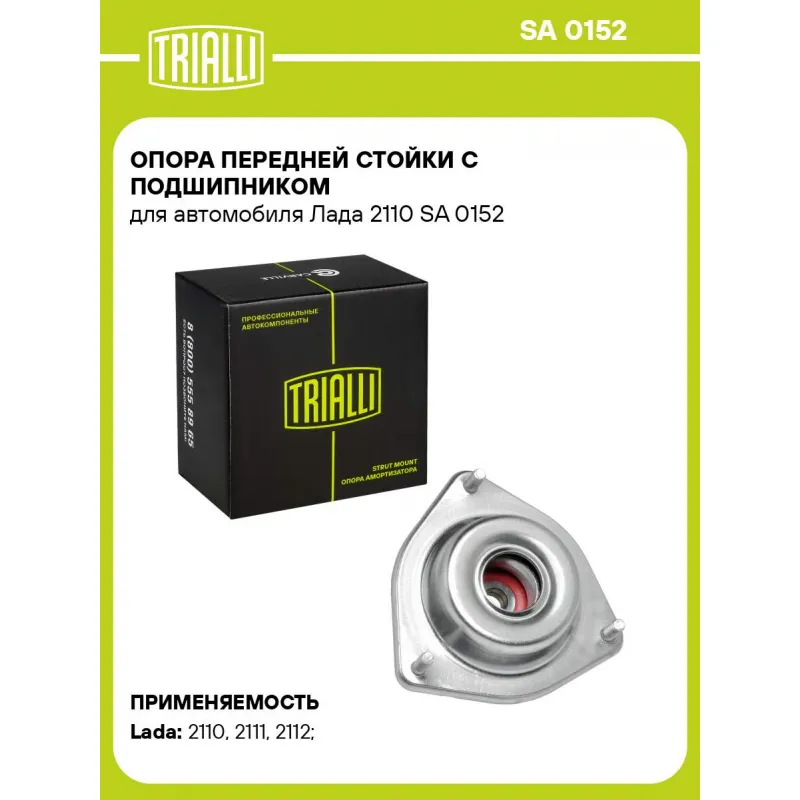Опора передней стойки с подшипником для автомобиля Лада 2110 Описание: Опора передней стойки с подшипником (амортизационная стойка) SA 0152 бренда TRIALLI - применяется в подвеске автомобиля, входят в состав передней амортизационной стойки и обеспечивают её крепление к кузову автомобиля, изолируют кузов от вибраций, передаваемых от подвески автомобиля, и обеспечивают поворот передних колёс. Особенности SA 0152: - Ось (сторона установки) - Спереди, слева/справа; - Сопутствующий товар: Амортизаторы: AG 01091; AG 01153; AG 01178; AG 01354; AG 01379; AG 01504; AH 01091; AH 01153; AH 01178; AH 01354; AH 01379; AH 01504; - Применяемость: BOGDAN 2110, 2111, LADA ВАЗ 2110-2112..Подбор по VIN-номеру вашего автомобиля - через кнопку 'Задать вопрос'. Специалист проверит применяемость и ответит вам. Преимущества: - Инновационная технология производства; - Контроль качества: - Дополнительная проверка с помощью 3D модели; - Проверка каждой позиции по чертежам; - Высокоэффективная система проектирования; Опора стойки в автомобиль состоит из металлического (стального) корпуса, резиновой проставки и подшипника металлического или металлопластикового. Подшипник представляет собой подшипник скольжения пластиковый - два пластмассовых диска, обеспечивающих скольжение друг относительно друга, или подшипник скольжения металлический - два металлических диска, разделенных пластмассовой вставкой. В нашем магазине, вы найдете широкий ассортимент высококачественных авто запчастей, ремонтные комплекты, опоры переднего/заднего амортизатора в машину, амортизаторы для автомобиля задние/передние. Характеристики: Артикул: SA 0152 OEM номера: 2110-2902820, 21100-2902820-00 Товарная линейка: BLACK Количество на автомобиль: 2 Материал: Резина/металл Ось (сторона установки): Спереди, слева/справа Сопутствующий товар: Амортизаторы: AG 01091; AG 01153; AG 01178; AG 01354; AG 01379; AG 01504; AH 01091; AH 01153; AH 01178; AH 01354; AH 01379; AH 01504 Гарантийный срок: 2 года/60 000 км Дополнительная информация: Упаковка изделия может отличаться от представленной на фото Подходит для авто: ВАЗ 2110, 2110, 2111, 2112 Для проверки применяемости отправьте VIN автомобиля через вкладку "Есть вопросы о товаре?" Комплектация: Опора амортизационной стойки в сборе с подшипником - 1 шт Гарантия: от 1 года.