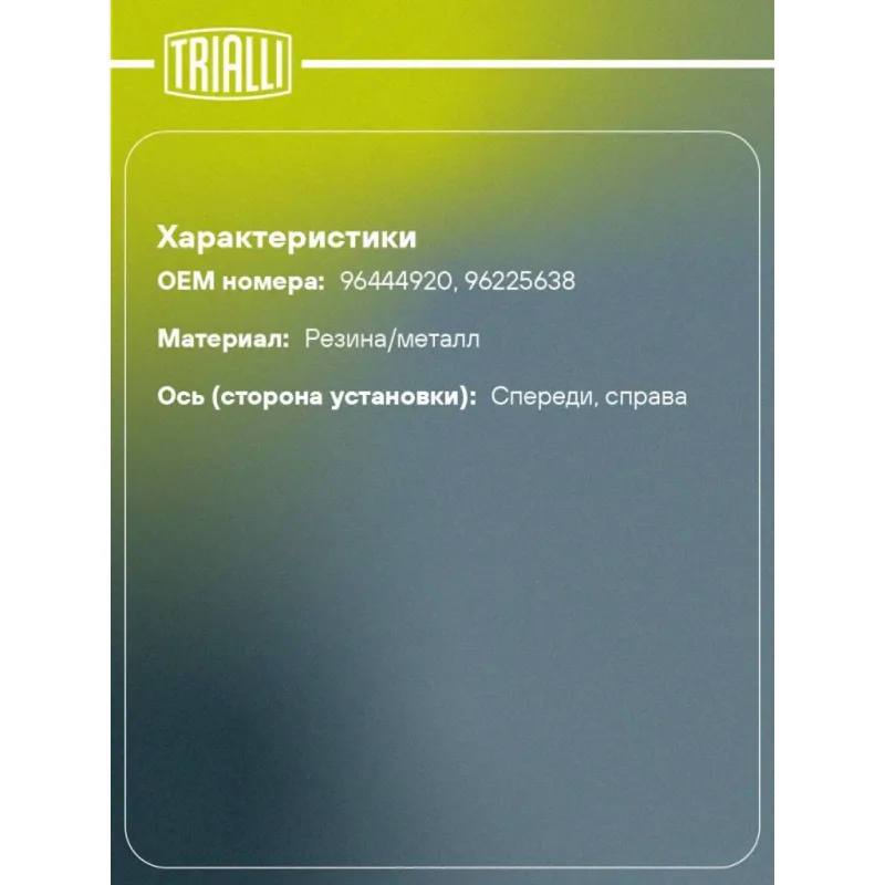Опора передней стойки с подшипником правая усиленная для автомобиля Chevrolet Lanos (02-) Характеристики: Артикул: SA 0571 OEM номера: 96444920, 96225638 Товарная линейка: BLACK Парный товар: SA 0570 Количество на автомобиль: 1 Материал: Резина/металл Ось (сторона установки): Спереди, справа Сопутствующий товар: Амортизаторы: AG 05091; AG 05501; AH 05091; AH 05501 Гарантийный срок: 2 года/60 000 км Дополнительная информация: Упаковка изделия может отличаться от представленной на фото Подходит для авто: Chevrolet Lanos (97-), Lanos (97-) Daewoo Lanos (97-), Lanos (97-) ZAZ-Daewoo Sens (02-) ЗАЗ Sens (02-), Chance (09-), Chance (09-) Для проверки применяемости отправьте VIN автомобиля через вкладку "Есть вопросы о товаре?" Комплектация: Опора амортизационной стойки в сборе с подшипником - 1 шт Чашка под пружину - 1 шт Гайка - 3 шт Болт - 3 шт Шайба - 3 шт Гарантия: от 1 года.