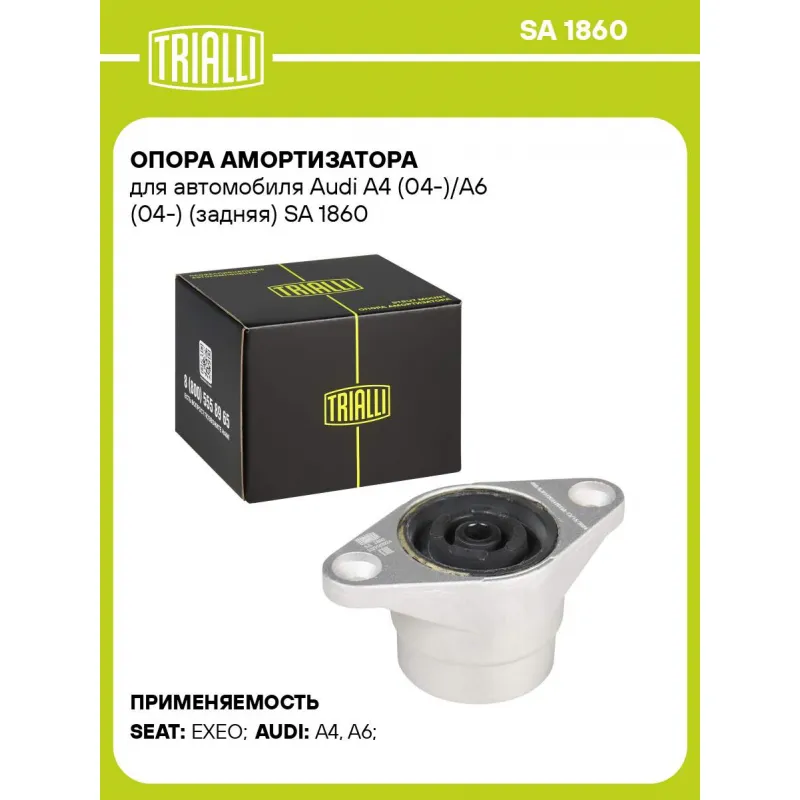 Опора амортизатора для автомобиля Audi A4 (04-)/A6 (04-) (задняя) Характеристики: Артикул: SA 1860 OEM номера: 4F0 513 353 B, 4F0 513 353 C, 4F0 513 353 D, 8E0 513 353 D Материал: Резина/металл Ось (сторона установки): Сзади, слева/справа Гарантийный срок: 2 года/60 000 км Товарная линейка: BLACK Количество на автомобиль: 2 Допо... Читать полностью →