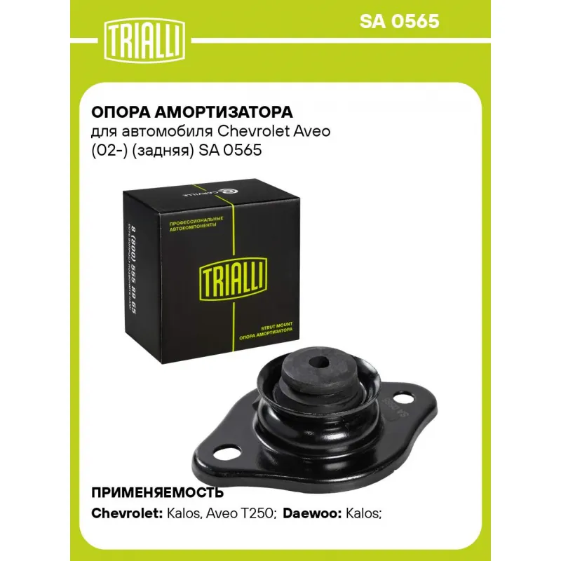 Опора амортизатора для автомобиля Chevrolet Aveo (02-) (задняя) Описание: Опора заднего амортизатора SA 0565 бренда TRIALLI применяются в подвеске автомобиля и отличается от опоры передней амортизационной стойки отсутствием подшипника, во всем остальном имеет схожую конструкцию и такие же функции, за исключением обеспечения поворота колеса. Особенности SA 0565: - Ось (сторона установки) - Спереди, слева/справа; - Сопутствующий товар: Амортизаторы: AG 05155; AG 05356; AG 05505; - Применяемость: CHEVROLET AVEO, DAEWOO AVEO / KALOS..Подбор по VIN-номеру вашего автомобиля - через кнопку 'Задать вопрос'. Специалист проверит применяемость и ответит вам. Преимущества: - Инновационная технология производства; - Контроль качества: - Дополнительная проверка с помощью 3D модели; - Проверка каждой позиции по чертежам; - Высокоэффективная система проектирования; Опора стойки в автомобиль состоит из металлического (стального) корпуса, резиновой проставки. В нашем магазине, вы найдете широкий ассортимент высококачественных авто запчастей, ремонтные комплекты, опоры переднего/заднего амортизатора в машину, амортизаторы для автомобиля задние/передние. Характеристики: Артикул: SA 0565 OEM номера: 96456713 Товарная линейка: BLACK Количество на автомобиль: 2 Материал: Резина/металл Ось (сторона установки): Спереди, слева/справа Сопутствующий товар: Амортизаторы: AG 05155; AG 05356; AG 05505 Гарантийный срок: 2 года/60 000 км Дополнительная информация: Упаковка изделия может отличаться от представленной на фото Подходит для авто: Chevrolet Kalos (05-), Aveo T250 (06-), Aveo T255 (08-), Aveo T200 (02-) Daewoo Kalos (02-) Для проверки применяемости отправьте VIN автомобиля через вкладку "Есть вопросы о товаре?" Комплектация: Опора амортизационной стойки - 1 шт Втулка резиновая - 1 шт Шайба прижимная - 1 шт Гарантия: от 1 года.