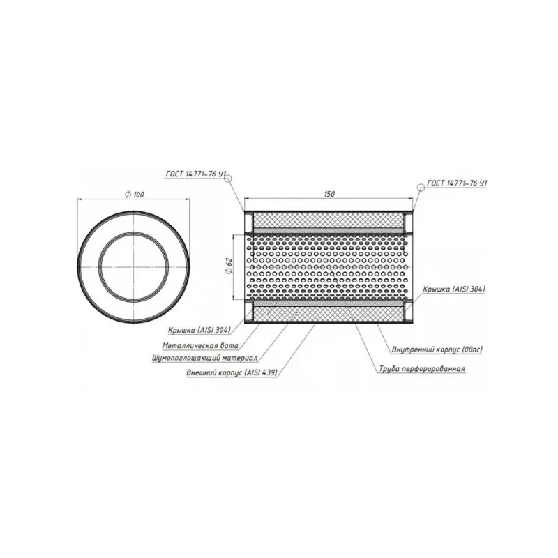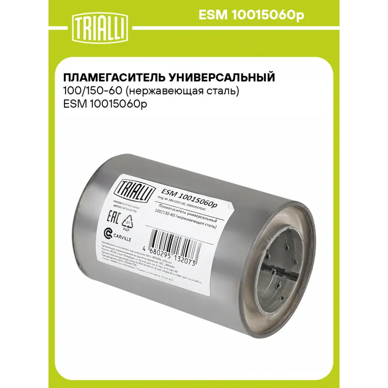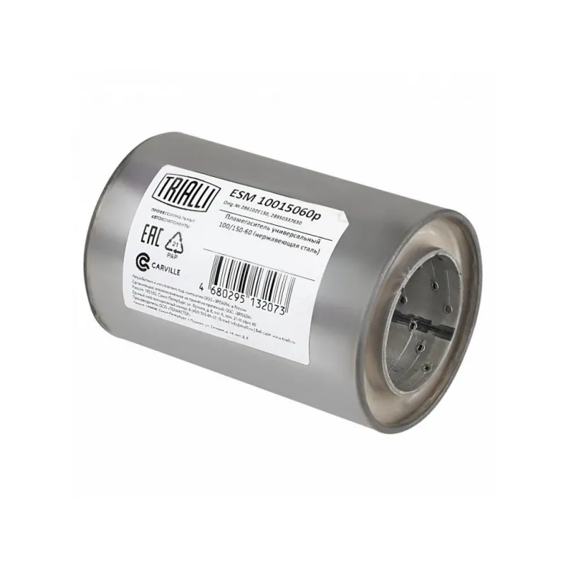 Пламегаситель универсальный 100/150-60 (нержавеющая сталь) Характеристики: Артикул: ESM 10015060p OEM номера: 286102E150, 28950337630, 286502E170, 287001F120, 285102BPF2, 286102Y500, 286502Y500, 287003U500, 286102S100, 289602G900, 286502S100, 287002Y100, 286102S300, 286502S300, 287002Y300, 28610-2E100, 2895037630, 286502E151, 28700-2E151, 286502E651, 287002E350, 289902F000, 14002JD90A, 20010JD200, 20100BR20A, 20010JD000, 20100JD00A, 1741037320, 1742037040, 1743037371, 2505126020, 1741026400, 1743026743, 2505126080, 1714137100, 1714037321, 1742037120, 1743037521, 2505126130, 1741026470, 2505128340, 1741028582, 1742028712, 1743037372, 20010JD20B, 208A0JG10B, 20010BR40A, 20100JD71B, 1583A028, 1570A842, 1570B175, 1571A703, 1741028551, 1742028470, 1743028720, 28610-C9200, 28610-M0200, 28610-M0250, 28710-M0200, 28710-M0250, 17410-0V390, 17420-0V340, 17430-0V340, 20010JG02A, 20100JG05A, 208A0JD50A, 20100JG70A, 18190r07e00, 18210-SWY-E11, 18160-R07-E00, 18220-SWY-E01, 18307-SWY-E01, 2851023820, 28610-2E100, 28950-23756, 28650-2E120, 28700-2E120, 28650-2E150, 28700-2E151, 17410-0H450, 17420-36120, 17430-36170, 1570A94, 1570A094, 1570A837, 1571A622, 140029Y920, 200108H70A, 200188H70A, 203008H31A, 201008H70A, 1742028320, 1743028510, 1K0254510X, 1K0253209BJ, 1Z3253609AE, 1K0253209CS, 1K5253609E, 1Z0253609AE, 18160RZPG00, 18210SWWE01, 18210-S10A01, 18160-P3FG10, 18160PHKG00, 18220-S10A03, 18030-S10A00, MN180083, MN156565, MN180617, 1570B398, 1571B053, 893253409B, 96345722, 13252425, A131201210FA, T111201110, 1234018, 1253560, 1329718, 1677751, 1364172, 30681701, 1329731, 1201210F00B1, 1201010F00, 1571B134, 6RU253609, 6RU253611B, 6RU253609S, 6RU253609T , 6RU253611E, 4A0253609A, 57253409C Количество на автомобиль: 1 Особенности конструкции:: Труба перфорированная и шумопоглощающий материал Гарантийный срок: 2 года/60 тыс. Длина, мм: 150 Диаметр корпуса, мм: 100 Диаметр перфор. трубы (мм): 62 Материал: Нержавеющая сталь AISI 439 Товарная линейка: BLACK Комплектация: Пламегаситель магистральный прямоточный - 1 шт Гарантия: от 1 года.