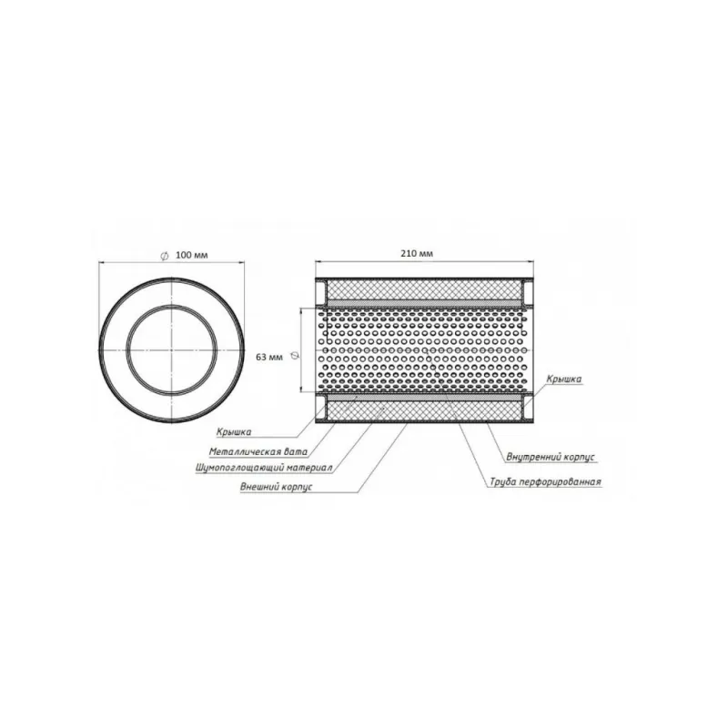 | Особенности конструкции: | Труба перфорированная, шерсть нержавеющая, набивка жаро-шумопоглощающая |