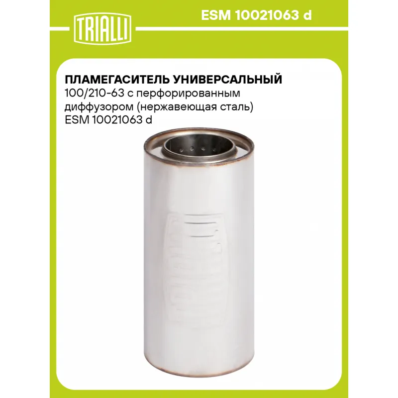 Пламегаситель универсальный 100/210-63 с перфорированным диффузором (нержавеющая сталь) Характеристики: Артикул: ESM 10021063 d OEM номера: 10021063 d Материал: Нержавеющая сталь AISI 430 Особенности конструкции:: Труба перфорированная с диффузором, шерсть нержавеющая, набивка жаро-шумопоглощающая Длина, мм: 210 Диаметр корпуса,... Читать полностью →