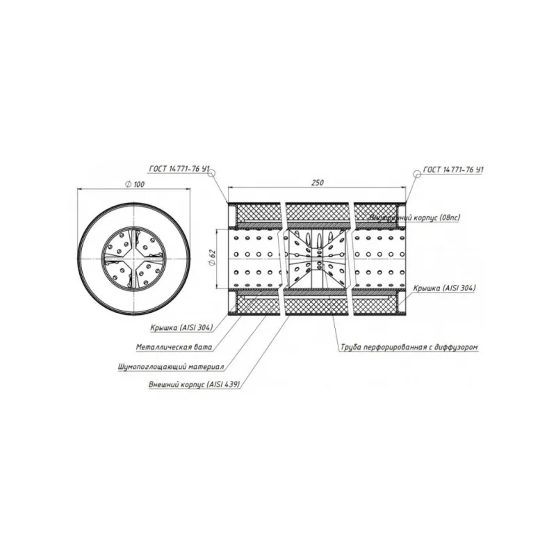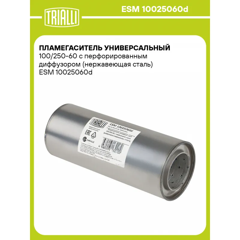 Пламегаситель универсальный 100/250-60 с перфорированным диффузором (нержавеющая сталь) Характеристики: Артикул: ESM 10025060d OEM номера: 286102E150, 28950337630, 286502E170, 287001F120, 285102BPF2, 286102Y500, 286502Y500, 287003U500, 286102S100, 289602G900, 286502S100, 287002Y100, 286102S300, 286502S300, 287002Y300, 28610-2E100, 2895037630, 286502E151, 28700-2E151, 286502E651, 287002E350, 289902F000, 14002JD90A, 20010JD200, 20100BR20A, 20010JD000, 20100JD00A, 1741037320, 1742037040, 1743037371, 2505126020, 1741026400, 1743026743, 2505126080, 1714137100, 1714037321, 1742037120, 1743037521, 2505126130, 1741026470, 2505128340, 1741028582, 1742028712, 1743037372, 20010JD20B, 208A0JG10B, 20010BR40A, 20100JD71B, 1583A028, 1570A842, 1570B175, 1571A703, 1741028551, 1742028470, 1743028720, 28610-C9200, 28610-M0200, 28610-M0250, 28710-M0200, 28710-M0250, 17410-0V390, 17420-0V340, 17430-0V340, 20010JG02A, 20100JG05A, 208A0JD50A, 20100JG70A, 18190r07e00, 18210-SWY-E11, 18160-R07-E00, 18220-SWY-E01, 18307-SWY-E01, 2851023820, 28610-2E100, 28950-23756, 28650-2E120, 28700-2E120, 28650-2E150, 28700-2E151, 17410-0H450, 17420-36120, 17430-36170, 1570A94, 1570A094, 1570A837, 1571A622, 140029Y920, 200108H70A, 200188H70A, 203008H31A, 201008H70A, 1742028320, 1743028510, 1K0254510X, 1K0253209BJ, 1Z3253609AE, 1K0253209CS, 1K5253609E, 1Z0253609AE, 18160RZPG00, 18210SWWE01, 18210-S10A01, 18160-P3FG10, 18160PHKG00, 18220-S10A03, 18030-S10A00, MN180083, MN156565, MN180617, 1570B398, 1571B053, 893253409B, 96345722, 13252425, A131201210FA, T111201110, 1234018, 1253560, 1329718, 1677751, 1364172, 30681701, 1329731, 1201210F00B1, 1201010F00, 1571B134, 6RU253609, 6RU253611B, 6RU253609S, 6RU253609T , 6RU253611E, 4A0253609A, 57253409C Количество на автомобиль: 1 Особенности конструкции:: Труба перфорированная с диффузором и шумопоглощающий материал Гарантийный срок: 2 года/60 тыс. Длина, мм: 250 Диаметр корпуса, мм: 100 Диаметр перфор. трубы (мм): 62 Материал: Нержавеющая сталь AISI 439 Товарная линейка: BLACK Комплектация: Пламегаситель с перфорированным диффузором - 1 шт Гарантия: от 1 года.