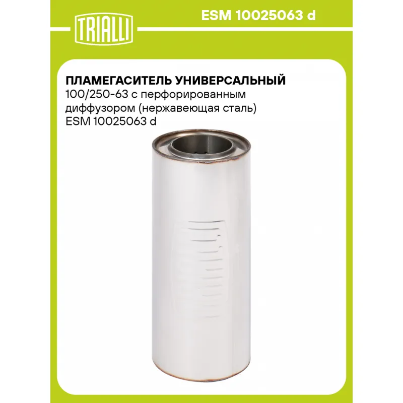 Пламегаситель универсальный 100/250-63 с перфорированным диффузором (нержавеющая сталь) Характеристики: Артикул: ESM 10025063 d OEM номера: 10025063 d Материал: Нержавеющая сталь AISI 430 Особенности конструкции:: Труба перфорированная с диффузором, шерсть нержавеющая, набивка жаро-шумопоглощающая Длина, мм: 250 Диаметр корпуса,... Читать полностью →