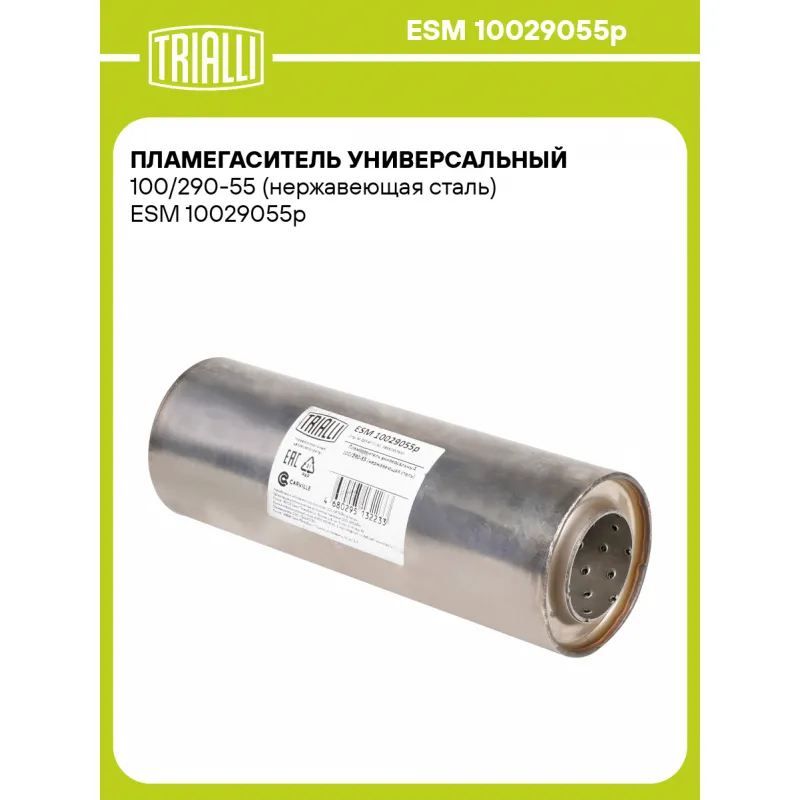 Пламегаситель универсальный 100/290-55 (нержавеющая сталь) Характеристики: Артикул: ESM 10029055p OEM номера: 286102E150, 28950337630, 286502E170, 287001F120, 285102BPF2, 286102Y500, 286502Y500, 287003U500, 286102S100, 289602G900, 286502S100, 287002Y100, 286102S300, 286502S300, 287002Y300, 28610-2E100, 2895037630, 286502E151, 28700-2E151, 286502E651, 287002E350, 289902F000, 14002JD90A, 20010JD200, 20100BR20A, 20010JD000, 20100JD00A, 1741037320, 1742037040, 1743037371, 2505126020, 1741026400, 1743026743, 2505126080, 1714137100, 1714037321, 1742037120, 1743037521, 2505126130, 1741026470, 2505128340, 1741028582, 1742028712, 1743037372, 20010JD20B, 208A0JG10B, 20010BR40A, 20100JD71B, 1583A028, 1570A842, 1570B175, 1571A703, 1741028551, 1742028470, 1743028720, 28610-C9200, 28610-M0200, 28610-M0250, 28710-M0200, 28710-M0250, 17410-0V390, 17420-0V340, 17430-0V340, 20010JG02A, 20100JG05A, 208A0JD50A, 20100JG70A, 18190r07e00, 18210-SWY-E11, 18160-R07-E00, 18220-SWY-E01, 18307-SWY-E01, 2851023820, 28610-2E100, 28950-23756, 28650-2E120, 28700-2E120, 28650-2E150, 28700-2E151, 17410-0H450, 17420-36120, 17430-36170, 1570A94, 1570A094, 1570A837, 1571A622, 140029Y920, 200108H70A, 200188H70A, 203008H31A, 201008H70A, 1742028320, 1743028510, 1K0254510X, 1K0253209BJ, 1Z3253609AE, 1K0253209CS, 1K5253609E, 1Z0253609AE, 18160RZPG00, 18210SWWE01, 18210-S10A01, 18160-P3FG10, 18160PHKG00, 18220-S10A03, 18030-S10A00, MN180083, MN156565, MN180617, 1570B398, 1571B053, 893253409B, 96345722, 13252425, A131201210FA, T111201110, 1234018, 1253560, 1329718, 1677751, 1364172, 30681701, 1329731, 1201210F00B1, 1201010F00, 1571B134, 6RU253609, 6RU253611B, 6RU253609S, 6RU253609T , 6RU253611E, 4A0253609A, 57253409C Количество на автомобиль: 1 Особенности конструкции:: Труба перфорированная и шумопоглощающий материал Гарантийный срок: 2 года/60 тыс. Длина, мм: 290 Диаметр корпуса, мм: 100 Диаметр перфор. трубы (мм): 57 Материал: Нержавеющая сталь AISI 439 Товарная линейка: BLACK Комплектация: Пламегаситель магистральный прямоточный - 1 шт Гарантия: от 1 года.