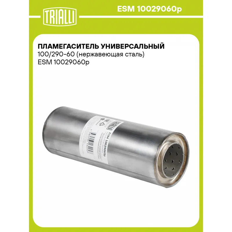Пламегаситель универсальный 100/290-60 (нержавеющая сталь) Характеристики: Артикул: ESM 10029060p OEM номера: 286102E150, 28950337630, 286502E170, 287001F120, 285102BPF2, 286102Y500, 286502Y500, 287003U500, 286102S100, 289602G900, 286502S100, 287002Y100, 286102S300, 286502S300, 287002Y300, 28610-2E100, 2895037630, 286502E151, 28700-2E151, 286502E651, 287002E350, 289902F000, 14002JD90A, 20010JD200, 20100BR20A, 20010JD000, 20100JD00A, 1741037320, 1742037040, 1743037371, 2505126020, 1741026400, 1743026743, 2505126080, 1714137100, 1714037321, 1742037120, 1743037521, 2505126130, 1741026470, 2505128340, 1741028582, 1742028712, 1743037372, 20010JD20B, 208A0JG10B, 20010BR40A, 20100JD71B, 1583A028, 1570A842, 1570B175, 1571A703, 1741028551, 1742028470, 1743028720, 28610-C9200, 28610-M0200, 28610-M0250, 28710-M0200, 28710-M0250, 17410-0V390, 17420-0V340, 17430-0V340, 20010JG02A, 20100JG05A, 208A0JD50A, 20100JG70A, 18190r07e00, 18210-SWY-E11, 18160-R07-E00, 18220-SWY-E01, 18307-SWY-E01, 2851023820, 28610-2E100, 28950-23756, 28650-2E120, 28700-2E120, 28650-2E150, 28700-2E151, 17410-0H450, 17420-36120, 17430-36170, 1570A94, 1570A094, 1570A837, 1571A622, 140029Y920, 200108H70A, 200188H70A, 203008H31A, 201008H70A, 1742028320, 1743028510, 1K0254510X, 1K0253209BJ, 1Z3253609AE, 1K0253209CS, 1K5253609E, 1Z0253609AE, 18160RZPG00, 18210SWWE01, 18210-S10A01, 18160-P3FG10, 18160PHKG00, 18220-S10A03, 18030-S10A00, MN180083, MN156565, MN180617, 1570B398, 1571B053, 893253409B, 96345722, 13252425, A131201210FA, T111201110, 1234018, 1253560, 1329718, 1677751, 1364172, 30681701, 1329731, 1201210F00B1, 1201010F00, 1571B134, 6RU253609, 6RU253611B, 6RU253609S, 6RU253609T , 6RU253611E, 4A0253609A, 57253409C Количество на автомобиль: 1 Особенности конструкции:: Труба перфорированная и шумопоглощающий материал Гарантийный срок: 2 года/60 тыс. Длина, мм: 290 Диаметр корпуса, мм: 100 Диаметр перфор. трубы (мм): 62 Материал: Нержавеющая сталь AISI 439 Товарная линейка: BLACK Комплектация: Пламегаситель магистральный прямоточный - 1 шт Гарантия: от 1 года.