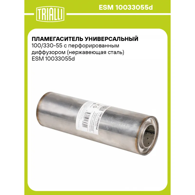 Пламегаситель универсальный 100/330-55 с перфорированным диффузором (нержавеющая сталь) Характеристики: Артикул: ESM 10033055d OEM номера: 286102E150, 28950337630, 286502E170, 287001F120, 285102BPF2, 286102Y500, 286502Y500, 287003U500, 286102S100, 289602G900, 286502S100, 287002Y100, 286102S300, 286502S300, 287002Y300, 28610-2E100, 2895037630, 286502E151, 28700-2E151, 286502E651, 287002E350, 289902F000, 14002JD90A, 20010JD200, 20100BR20A, 20010JD000, 20100JD00A, 1741037320, 1742037040, 1743037371, 2505126020, 1741026400, 1743026743, 2505126080, 1714137100, 1714037321, 1742037120, 1743037521, 2505126130, 1741026470, 2505128340, 1741028582, 1742028712, 1743037372, 20010JD20B, 208A0JG10B, 20010BR40A, 20100JD71B, 1583A028, 1570A842, 1570B175, 1571A703, 1741028551, 1742028470, 1743028720, 28610-C9200, 28610-M0200, 28610-M0250, 28710-M0200, 28710-M0250, 17410-0V390, 17420-0V340, 17430-0V340, 20010JG02A, 20100JG05A, 208A0JD50A, 20100JG70A, 18190r07e00, 18210-SWY-E11, 18160-R07-E00, 18220-SWY-E01, 18307-SWY-E01, 2851023820, 28610-2E100, 28950-23756, 28650-2E120, 28700-2E120, 28650-2E150, 28700-2E151, 17410-0H450, 17420-36120, 17430-36170, 1570A94, 1570A094, 1570A837, 1571A622, 140029Y920, 200108H70A, 200188H70A, 203008H31A, 201008H70A, 1742028320, 1743028510, 1K0254510X, 1K0253209BJ, 1Z3253609AE, 1K0253209CS, 1K5253609E, 1Z0253609AE, 18160RZPG00, 18210SWWE01, 18210-S10A01, 18160-P3FG10, 18160PHKG00, 18220-S10A03, 18030-S10A00, MN180083, MN156565, MN180617, 1570B398, 1571B053, 893253409B, 96345722, 13252425, A131201210FA, T111201110, 1234018, 1253560, 1329718, 1677751, 1364172, 30681701, 1329731, 1201210F00B1, 1201010F00, 1571B134, 6RU253609, 6RU253611B, 6RU253609S, 6RU253609T , 6RU253611E, 4A0253609A, 57253409C Количество на автомобиль: 1 Особенности конструкции:: Труба перфорированная с диффузором и шумопоглощающий материал Гарантийный срок: 2 года/60 тыс. Длина, мм: 330 Диаметр корпуса, мм: 100 Диаметр перфор. трубы (мм): 57 Материал: Нержавеющая сталь AISI 439 Товарная линейка: BLACK Комплектация: Пламегаситель с перфорированным диффузором - 1 шт Гарантия: от 1 года.