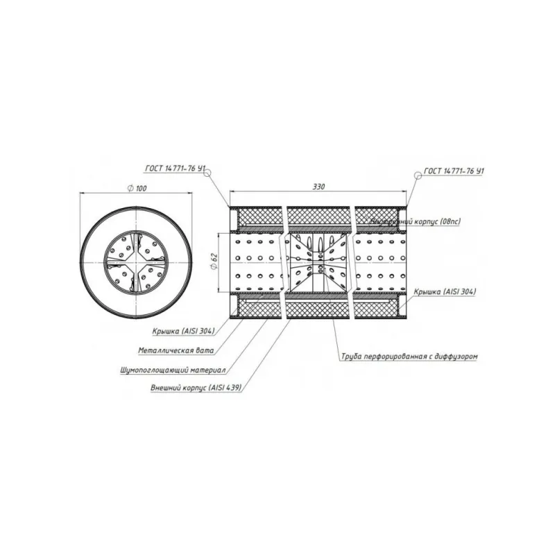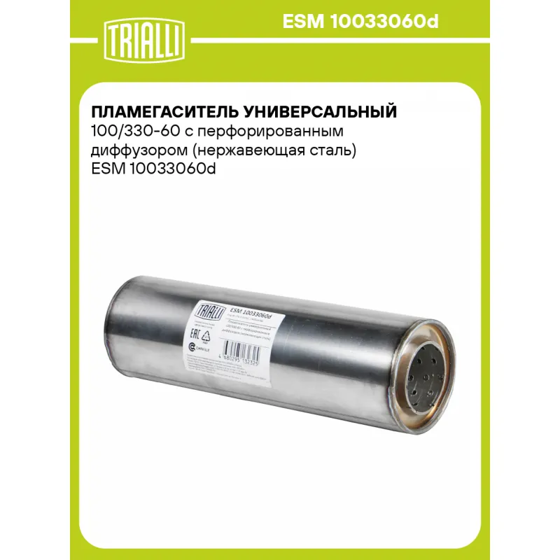 Пламегаситель универсальный 100/330-60 с перфорированным диффузором (нержавеющая сталь) Характеристики: Артикул: ESM 10033060d OEM номера: 17410-0V390, 17420-0V340, 17430-0V340, 14002JD90A, 20010JG02A, 20100JG05A, 208A0JD50A, 20100JG70A, 18190r07e00, 18210-SWY-E11, 18160-R07-E00, 18220-SWY-E01, 18307-SWY-E01, 2851023820, 28610-2E100, 28950-23756, 28650-2E120, 28700-2E120, 28650-2E150, 28700-2E151, 17410-0H450, 17420-36120, 17430-36170, 1570A94, 1570A094, 1570A837, 1571A622, 140029Y920, 200108H70A, 200188H70A, 203008H31A, 201008H70A, 28610-2E100, 2895037630, 286502E151, 28700-2E151, 286502E170, 287001F120, 286502E651, 287002E350, 1742028320, 1743028510, 1741028551, 1742028470, 1743028720, 1K0254510X, 1K0253209BJ, 1Z3253609AE, 1K0253209CS, 1K5253609E, 1Z0253609AE, 18160RZPG00, 18210SWWE01, 18210-S10A01, 18160-P3FG10, 18160PHKG00, 18220-S10A03, 18030-S10A00, 1583A028, MN180083, MN156565, MN180617, 1570B398, 1571B053, 893253409B, 96345722, 13252425, A131201210FA, T111201110, 1234018, 1253560, 1329718, 1677751, 1364172, 30681701, 1329731, 1201210F00B1, 1201010F00, 1571A703, 1571B134, 6RU253609, 6RU253611B, 6RU253609S, 6RU253609T , 6RU253611E, 286102E150, 28950337630, 285102BPF2, 286102Y500, 286502Y500, 287003U500, 286102S100, 289602G900, 286502S100, 287002Y100, 286102S300, 286502S300, 287002Y300, 289902F000, 20010JD200, 20100BR20A, 20010JD000, 20100JD00A, 1741037320, 1742037040, 1743037371, 2505126020, 1741026400, 1743026743, 2505126080, 1714137100, 1714037321, 1742037120, 1743037521, 2505126130, 1741026470, 2505128340, 1741028582, 1742028712, 1743037372, 20010JD20B, 208A0JG10B, 20010BR40A, 20100JD71B, 1570A842, 1570B175, 28610-C9200, 28610-M0200, 28610-M0250, 28710-M0200, 28710-M0250, 4A0253609A, 57253409C Количество на автомобиль: 1 Особенности конструкции:: Труба перфорированная с диффузором и шумопоглощающий материал Гарантийный срок: 2 года/60 тыс. Длина, мм: 330 Диаметр корпуса, мм: 100 Диаметр перфор. трубы (мм): 62 Материал: Нержавеющая сталь AISI 439 Товарная линейка: BLACK Комплектация: Пламегаситель с перфорированным диффузором - 1 шт Гарантия: от 1 года.