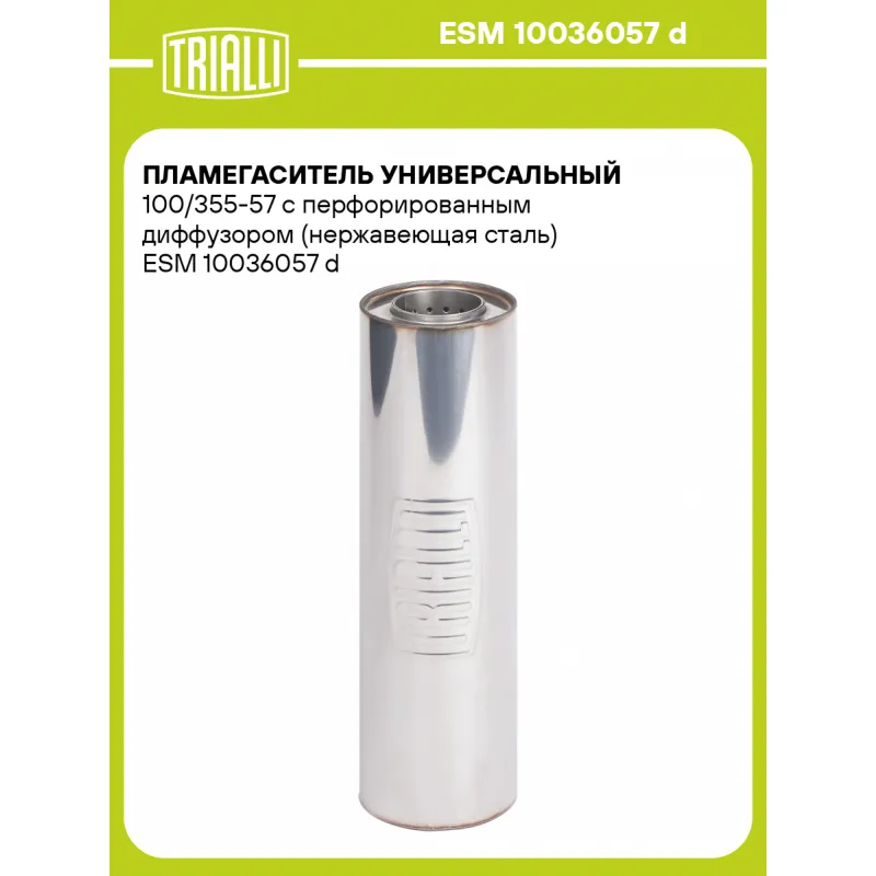 Пламегаситель универсальный 100/355-57 с перфорированным диффузором (нержавеющая сталь) Характеристики: Артикул: ESM 10036057 d OEM номера: 10036057 d Материал: Нержавеющая сталь AISI 430 Особенности конструкции:: Труба перфорированная с диффузором, шерсть нержавеющая, набивка жаро-шумопоглощающая Длина, мм: 355 Диаметр корпуса,... Читать полностью →