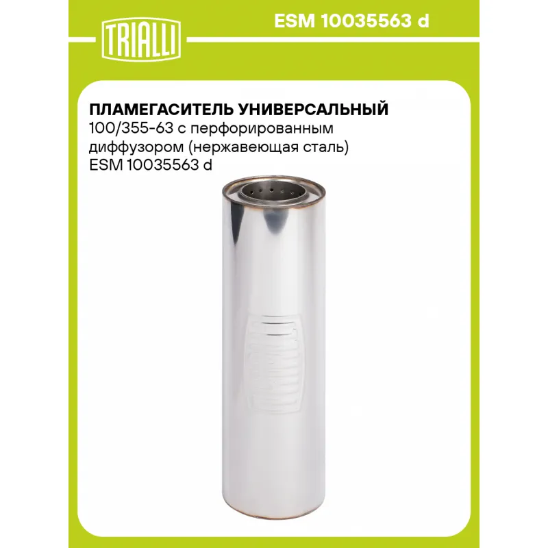 Пламегаситель универсальный 100/355-63 с перфорированным диффузором (нержавеющая сталь) Характеристики: Артикул: ESM 10035563 d OEM номера: 10035563 d Материал: Нержавеющая сталь AISI 430 Особенности конструкции:: Труба перфорированная с диффузором, шерсть нержавеющая, набивка жаро-шумопоглощающая Длина, мм: 355 Диаметр корпуса,... Читать полностью →