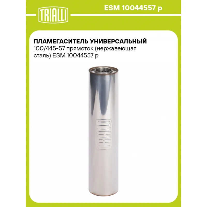 Пламегаситель универсальный 100/445-57 прямоток (нержавеющая сталь) Характеристики: Артикул: ESM 10044557 p OEM номера: 10044557 p Материал: Нержавеющая сталь AISI 430 Особенности конструкции:: Труба перфорированная, шерсть нержавеющая, набивка жаро-шумопоглощающая Длина, мм: 445 Диаметр корпуса, мм: 100 Гарантийный срок: 2 года... Читать полностью →