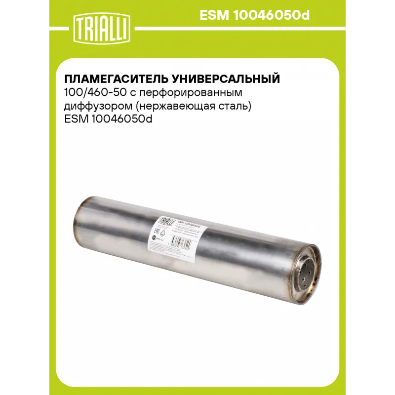 Пламегаситель универсальный 100/460-50 с перфорированным диффузором (нержавеющая сталь) Характеристики: Артикул: ESM 10046050d OEM номера: 2505147010, 1742022110, 1710422120, 1741022560, 171040D100, 174100D330, 28710-A0150, 28650-A0150, 28610-A0100, 28610-M0150, 28650-M0150, 28710-M0100, 28710-M0150, 8200916974, 8200906479, 200100277R, 8200916976, 200101KA0A, 203001KA0A, 201001KA0A, 2505147070, 20010JD000, 20100JD00A, 2851026430, 286101G300, 287001G300, 287301G400, 171040D031, 1741022310, 1743022320, 174022140, 174600D050, 1742022010, 1743022120, 174101A480, 1742016720, 174301D010, 1746022010, B08A0BM701, 200105M370, 20300BM500, 20100BM520, B08A0-AU000, 20010BN805, 20300BN800, 20300BN810, 20010BN815, 203005M770, 286102E150, 28950337630, 286502E170, 287001F120, 285102BPF2, 286102Y500, 286502Y500, 287003U500, 286102S100, 289602G900, 286502S100, 287002Y100, 286102S300, 286502S300, 287002Y300, 28610-2E100, 2895037630, 286502E151, 28700-2E151, 286502E651, 287002E350, 289902F000, 14002JD90A, 20010JD200, 20100BR20A, 1741037320, 1742037040, 1743037371, 2505126020, 1741026400, 1743026743, 2505126080, 1714137100, 1714037321, 1742037120, 1743037521, 2505126130, 1741026470, 2505128340, 1741028582, 1742028712, 1743037372, 20010JD20B, 208A0JG10B, 20010BR40A, 20100JD71B, 1583A028, 1570A519, MR552606, MR993500, 1570A842, 1570B175, 1571A703, MN156051, 52039793, 94763377, 94763374, 20010-95F0B, 2001095F0C, 20300-95F0D, 20300-95F0C, 20300-95F0F, 20100-95F0A, 20100-95F0D, 28990-2A690, 28990-2A830, 28610-A2800, 28600-A2870, 28600-A2800, 2001000Q1A, 20010-00Q1J, 20010-00Q1K, Z6Y32050XC, Z6682050XA, Z60440300B, 1K0254505RX, 1K0254511LX, 1K0253209EN, 1K0253209J, 1K5253609, 1K0254500BX, 28610-C9100, 28650-M0100, K0254510X, 1K0253209BJ, 1Z3253609AE, 1K0253209CS, 1K5253609E, 1Z0253609AE, 1KO254303NX, 1F0254401FX, 1K0253209K, 28510-2B420, 285102B460, 28610-1H000, 28700-1H000, 289402A780, 28610-2L510, 28950-2A630, 28700-1H500, 1570A743, 1570B110, 1571A930, 1J0254502QX, 1J0253209, 1J5253609C, 1570B161, 1570B443, 28510-22BIH0, 28610-1H150, 28700-1H370, 28700-1H170, 1741028551, 1742028470, 1743028720, 28610-C9200, 28610-M0200, 28610-M0250, 28710-M0200, 28710-M0250, 17410-0V390, 17420-0V340, 17430-0V340, 20010JG02A, 20100JG05A, 208A0JD50A, 20100JG70A, 18190r07e00, 18210-SWY-E11, 18160-R07-E00, 18220-SWY-E01, 18307-SWY-E01, 2851023820, 28610-2E100, 28950-23756, 28650-2E120, 28700-2E120, 28650-2E150, 28700-2E151, 17410-0H450, 17420-36120, 17430-36170, 1570A94, 1570A094, 1570A837, 1571A622, 140029Y920, 200108H70A, 200188H70A, 203008H31A, 201008H70A, 1742028320, 1743028510, 1K0254510X, 18160RZPG00, 18210SWWE01, 18210-S10A01, 18160-P3FG10, 18160PHKG00, 18220-S10A03, 18030-S10A00, MN180083, MN156565, MN180617, 1570B398, 1571B053, 357253409C Количество на автомобиль: 1 Особенности конструкции:: Труба перфорированная с диффузором и шумопоглощающий материал Гарантийный срок: 2 года/60 тыс. Длина, мм: 460 Диаметр корпуса, мм: 100 Диаметр перфор. трубы (мм): 52 Материал: Нержавеющая сталь AISI 439 Товарная линейка: BLACK Комплектация: Пламегаситель с перфорированным диффузором - 1 шт Гарантия: от 1 года.