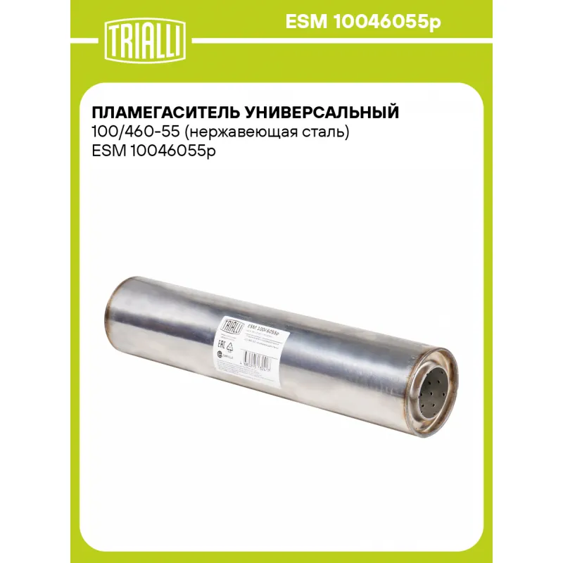 Пламегаситель универсальный 100/460-55 (нержавеющая сталь) Характеристики: Артикул: ESM 10046055p OEM номера: 286102E150, 28950337630, 286502E170, 287001F120, 285102BPF2, 286102Y500, 286502Y500, 287003U500, 286102S100, 289602G900, 286502S100, 287002Y100, 286102S300, 286502S300, 287002Y300, 28610-2E100, 2895037630, 286502E151, 28700-2E151, 286502E651, 287002E350, 289902F000, 14002JD90A, 20010JD200, 20100BR20A, 20010JD000, 20100JD00A, 1741037320, 1742037040, 1743037371, 2505126020, 1741026400, 1743026743, 2505126080, 1714137100, 1714037321, 1742037120, 1743037521, 2505126130, 1741026470, 2505128340, 1741028582, 1742028712, 1743037372, 20010JD20B, 208A0JG10B, 20010BR40A, 20100JD71B, 1583A028, 1570A842, 1570B175, 1571A703, 1741028551, 1742028470, 1743028720, 28610-C9200, 28610-M0200, 28610-M0250, 28710-M0200, 28710-M0250, 17410-0V390, 17420-0V340, 17430-0V340, 20010JG02A, 20100JG05A, 208A0JD50A, 20100JG70A, 18190r07e00, 18210-SWY-E11, 18160-R07-E00, 18220-SWY-E01, 18307-SWY-E01, 2851023820, 28610-2E100, 28950-23756, 28650-2E120, 28700-2E120, 28650-2E150, 28700-2E151, 17410-0H450, 17420-36120, 17430-36170, 1570A94, 1570A094, 1570A837, 1571A622, 140029Y920, 200108H70A, 200188H70A, 203008H31A, 201008H70A, 1742028320, 1743028510, 1K0254510X, 1K0253209BJ, 1Z3253609AE, 1K0253209CS, 1K5253609E, 1Z0253609AE, 18160RZPG00, 18210SWWE01, 18210-S10A01, 18160-P3FG10, 18160PHKG00, 18220-S10A03, 18030-S10A00, MN180083, MN156565, MN180617, 1570B398, 1571B053, 893253409B, 96345722, 13252425, A131201210FA, T111201110, 1234018, 1253560, 1329718, 1677751, 1364172, 30681701, 1329731, 1201210F00B1, 1201010F00, 1571B134, 6RU253609, 6RU253611B, 6RU253609S, 6RU253609T , 6RU253611E, 4A0253609A, 57253409C Количество на автомобиль: 1 Особенности конструкции:: Труба перфорированная и шумопоглощающий материал Гарантийный срок: 2 года/60 тыс. Длина, мм: 460 Диаметр корпуса, мм: 100 Диаметр перфор. трубы (мм): 57 Материал: Нержавеющая сталь AISI 439 Товарная линейка: BLACK Комплектация: Пламегаситель магистральный прямоточный - 1 шт Гарантия: от 1 года.