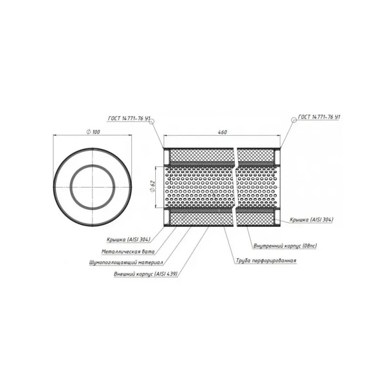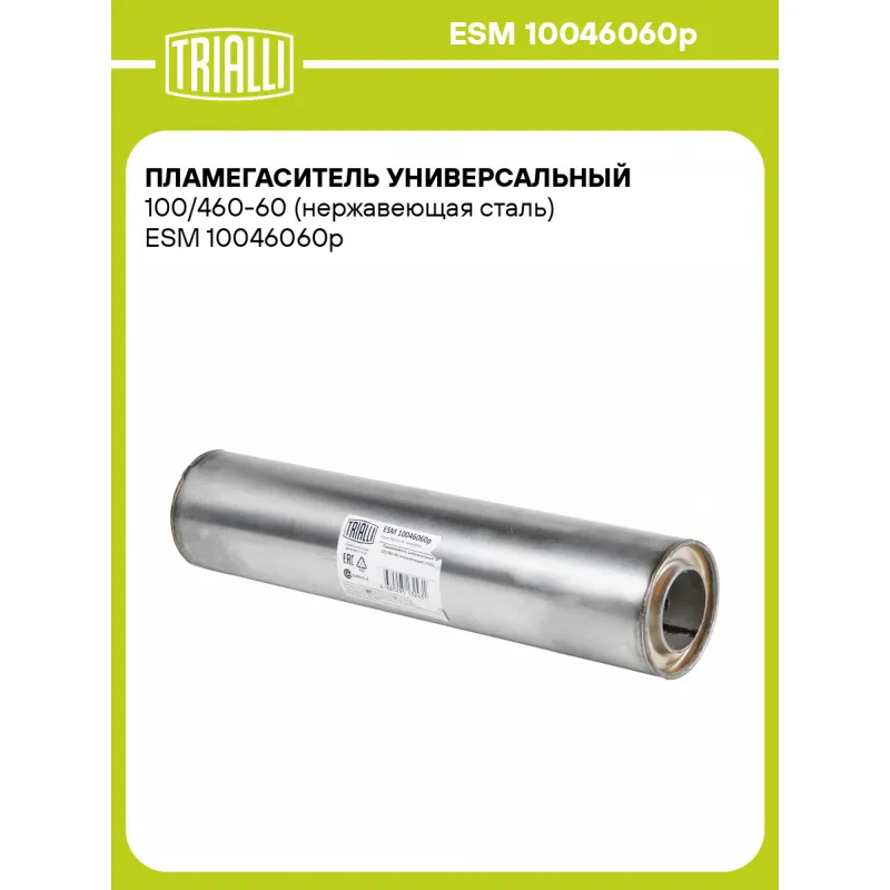 Пламегаситель универсальный 100/460-60 (нержавеющая сталь) Характеристики: Артикул: ESM 10046060p OEM номера: 286102E150, 28950337630, 286502E170, 287001F120, 285102BPF2, 286102Y500, 286502Y500, 287003U500, 286102S100, 289602G900, 286502S100, 287002Y100, 286102S300, 286502S300, 287002Y300, 28610-2E100, 2895037630, 286502E151, 28700-2E151, 286502E651, 287002E350, 289902F000, 14002JD90A, 20010JD200, 20100BR20A, 20010JD000, 20100JD00A, 1741037320, 1742037040, 1743037371, 2505126020, 1741026400, 1743026743, 2505126080, 1714137100, 1714037321, 1742037120, 1743037521, 2505126130, 1741026470, 2505128340, 1741028582, 1742028712, 1743037372, 20010JD20B, 208A0JG10B, 20010BR40A, 20100JD71B, 1583A028, 1570A842, 1570B175, 1571A703, 1741028551, 1742028470, 1743028720, 28610-C9200, 28610-M0200, 28610-M0250, 28710-M0200, 28710-M0250, 17410-0V390, 17420-0V340, 17430-0V340, 20010JG02A, 20100JG05A, 208A0JD50A, 20100JG70A, 18190r07e00, 18210-SWY-E11, 18160-R07-E00, 18220-SWY-E01, 18307-SWY-E01, 2851023820, 28610-2E100, 28950-23756, 28650-2E120, 28700-2E120, 28650-2E150, 28700-2E151, 17410-0H450, 17420-36120, 17430-36170, 1570A94, 1570A094, 1570A837, 1571A622, 140029Y920, 200108H70A, 200188H70A, 203008H31A, 201008H70A, 1742028320, 1743028510, 1K0254510X, 1K0253209BJ, 1Z3253609AE, 1K0253209CS, 1K5253609E, 1Z0253609AE, 18160RZPG00, 18210SWWE01, 18210-S10A01, 18160-P3FG10, 18160PHKG00, 18220-S10A03, 18030-S10A00, MN180083, MN156565, MN180617, 1570B398, 1571B053, 893253409B, 96345722, 13252425, A131201210FA, T111201110, 1234018, 1253560, 1329718, 1677751, 1364172, 30681701, 1329731, 1201210F00B1, 1201010F00, 1571B134, 6RU253609, 6RU253611B, 6RU253609S, 6RU253609T , 6RU253611E, 57253409C, 4A0253609A Количество на автомобиль: 1 Особенности конструкции:: Труба перфорированная и шумопоглощающий материал Гарантийный срок: 2 года/60 тыс. Длина, мм: 460 Диаметр корпуса, мм: 100 Диаметр перфор. трубы (мм): 62 Материал: Нержавеющая сталь AISI 439 Товарная линейка: BLACK Комплектация: Пламегаситель магистральный прямоточный - 1 шт Гарантия: от 1 года.