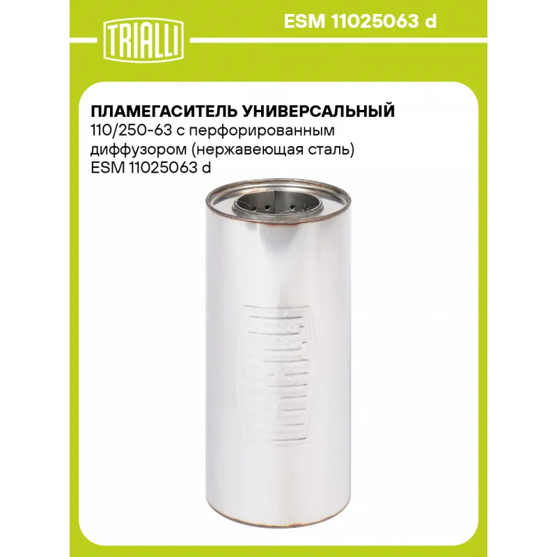 Пламегаситель универсальный 110/250-63 с перфорированным диффузором (нержавеющая сталь) Характеристики: Артикул: ESM 11025063 d OEM номера: 11025063 d Материал: Нержавеющая сталь AISI 430 Особенности конструкции:: Труба перфорированная с диффузором, шерсть нержавеющая, набивка жаро-шумопоглощающая Длина, мм: 250 Диаметр корпуса,... Читать полностью →