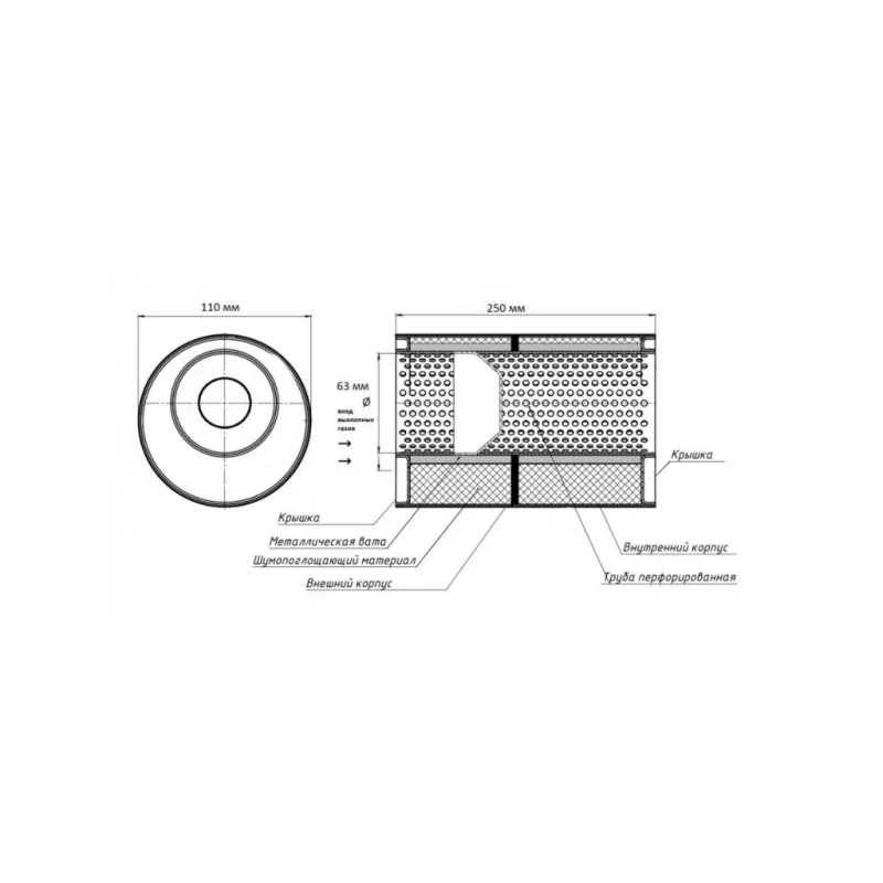 | Особенности конструкции: | Труба перфорированная с диффузором, шерсть нержавеющая, набивка жаро-шумопоглощающая |