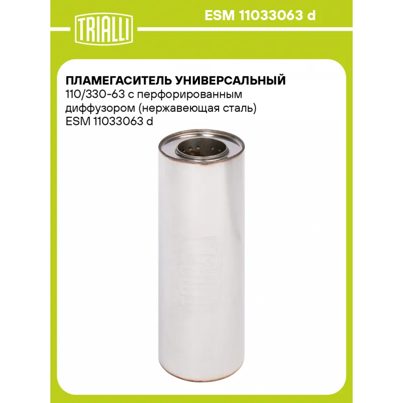 Пламегаситель универсальный 110/330-63 с перфорированным диффузором (нержавеющая сталь) Характеристики: Артикул: ESM 11033063 d OEM номера: 11033063 d Материал: Нержавеющая сталь AISI 430 Особенности конструкции:: Труба перфорированная с диффузором, шерсть нержавеющая, набивка жаро-шумопоглощающая Длина, мм: 330 Диаметр корпуса,... Читать полностью →