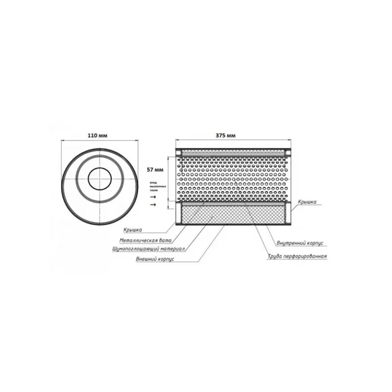 | Особенности конструкции: | Труба перфорированная, шерсть нержавеющая, набивка жаро-шумопоглощающая |