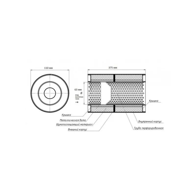 Особенности конструкции: Труба перфорированная с диффузором, шерсть нержавеющая, набивка жаро-шумопоглощающая