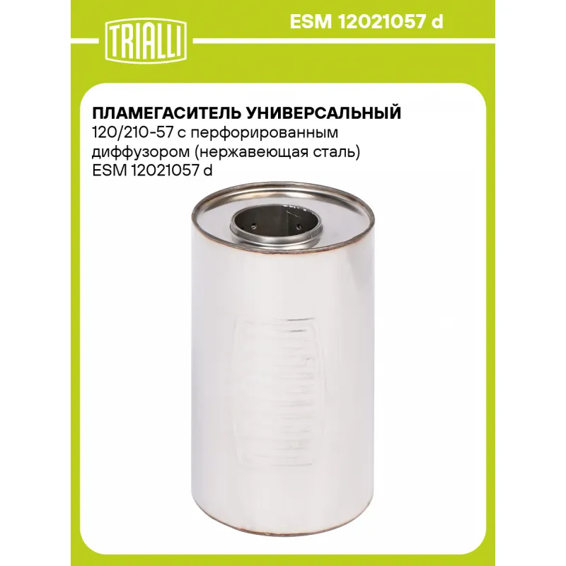 Пламегаситель универсальный 120/210-57 с перфорированным диффузором (нержавеющая сталь) Характеристики: Артикул: ESM 12021057 d OEM номера: 12021057 d Материал: Нержавеющая сталь AISI 430 Особенности конструкции:: Труба перфорированная с диффузором, шерсть нержавеющая, набивка жаро-шумопоглощающая Длина, мм: 210 Диаметр корпуса,... Читать полностью →